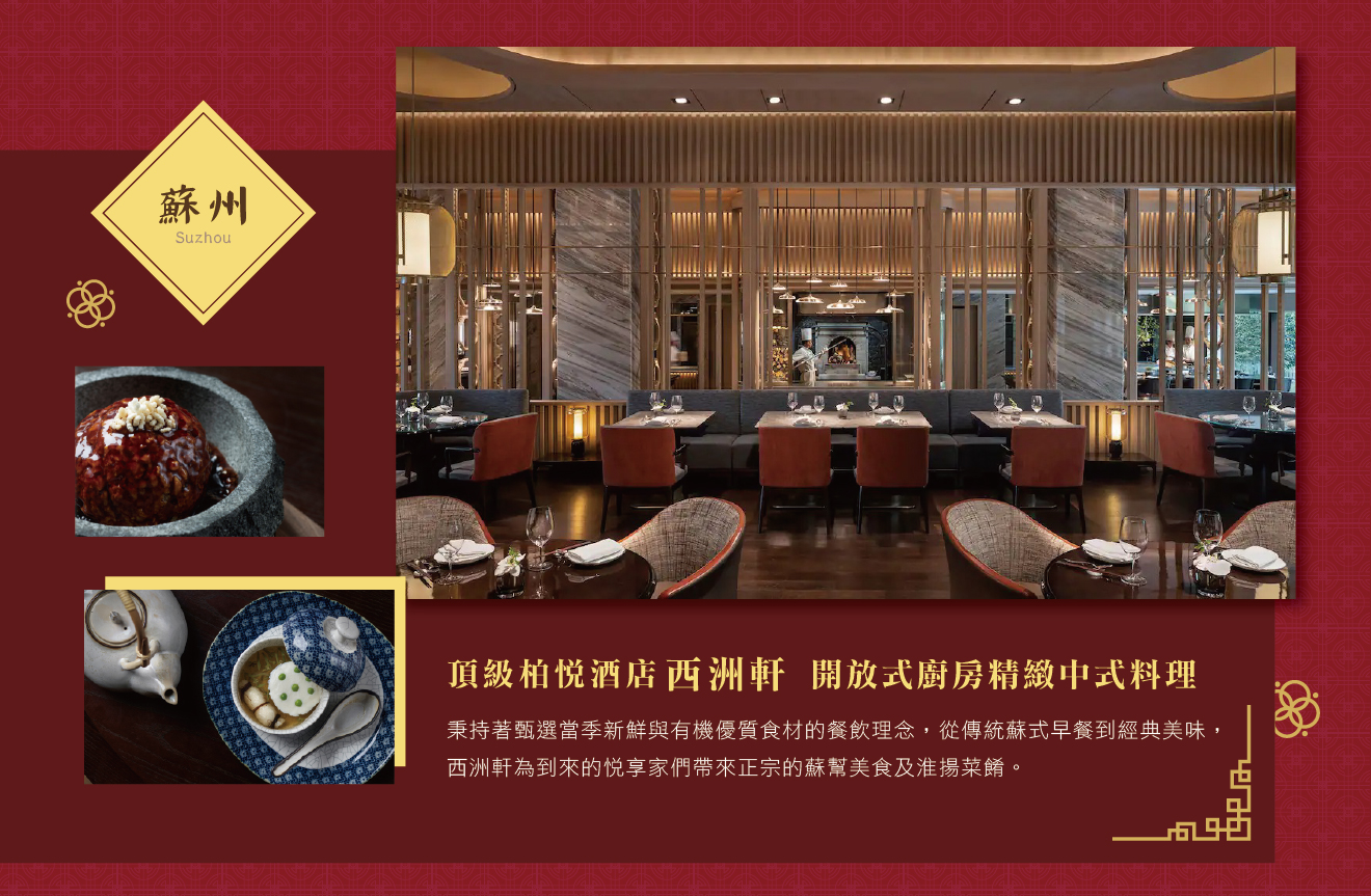 早餐:酒店內 午餐:特別安排百年老店蘇州菜特色風味 晚餐:特別安排頂級柏悅酒店內西洲軒開放式廚房精緻中式料理