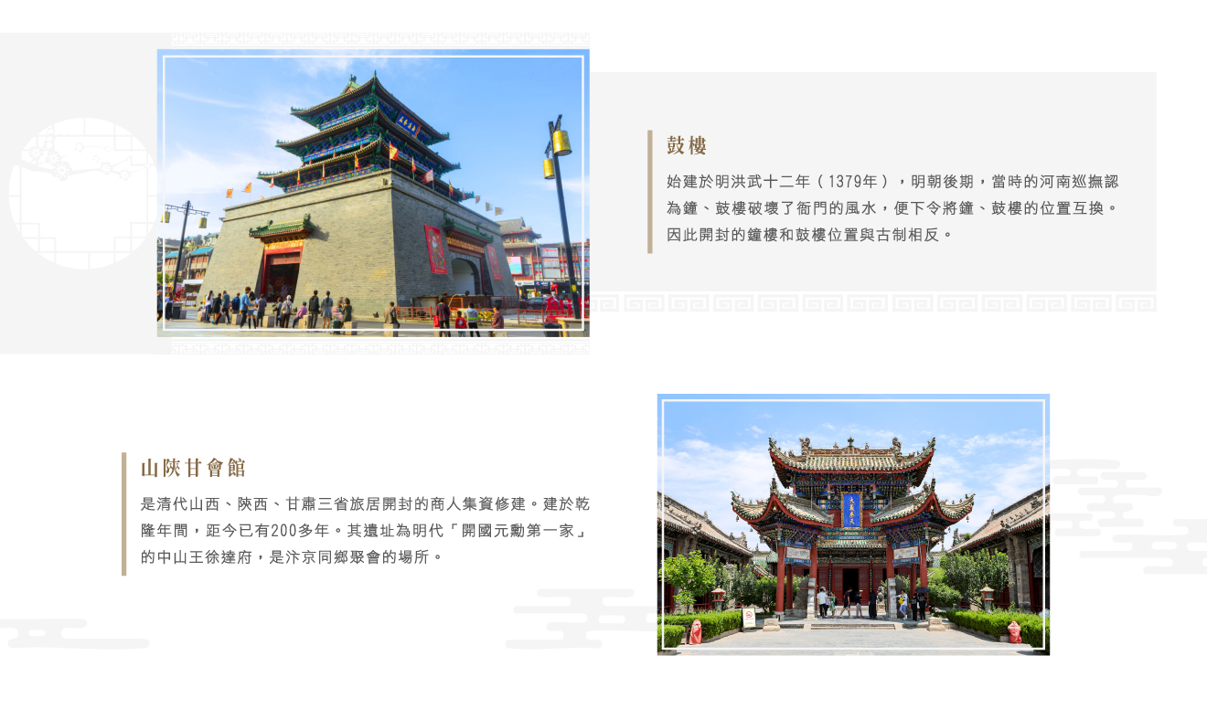 【鼓樓】位於書店街南端,始建於明洪武十二年(1379年),鼓樓東西對稱,在一條線上,十分威嚴、齊整。明朝後期,當時的河南巡撫認為鐘、鼓樓破壞了衙門的風水,便下令將鐘、鼓樓的位置互換。因此開封的鐘樓和鼓樓位置與古制相反。