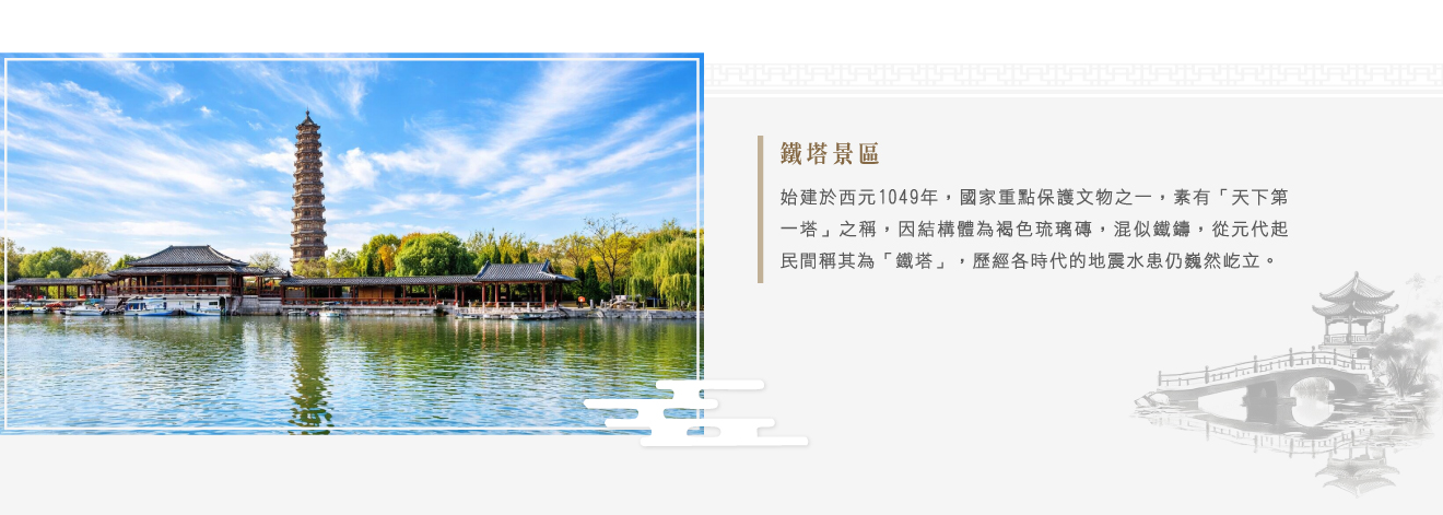 【鐵塔景區】位於北門大街鐵塔公園內,始建於西元1049年(北宋皇祐元年),國家重點保護文物之一,素有“天下第一塔”之稱。鐵塔高55.88公尺,八角十三層,因此地曾為開寶寺,又稱“開寶寺塔”,又因結構體為褐色琉璃磚,混似鐵鑄,從元代起民間稱其為“鐵塔”,歷經各時代的地震水患仍巍然屹立。