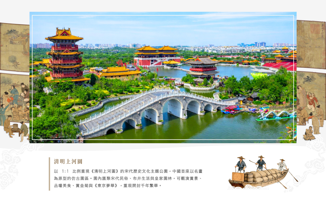 【清明上河園】是按照1:1的比例把宋代著名畫家張擇端的代表作,中華民族藝術之瑰寶的《清明上河圖》再現的大型宋代歷史文化主題公園, 這也是中國第一座以繪畫作品為原型的仿古主題公園。在這裡不僅能感受大宋民俗風情、市井文化、皇家園林和各種娛樂項目,還能品美食、賞金菊,看東京夢華,領略開封千年繁華的盛景。