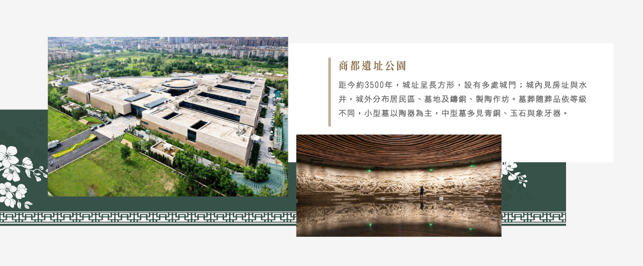 【商都遺址公園】年代距今3500年左右。商城平面為長方形,有11個缺口,其中有的是城門,城內東北部有宮殿區,發現宮殿基址多處,中心有用石板建造而成的人工蓄水設施。城中還有小型房址和水井遺址。城外有居民區、墓地、鑄銅遺址及製陶、製骨作坊址等;小型墓的陪葬品以陶器為主;中型墓碑多以青銅禮器、玉石器及象牙器做為陪葬品。