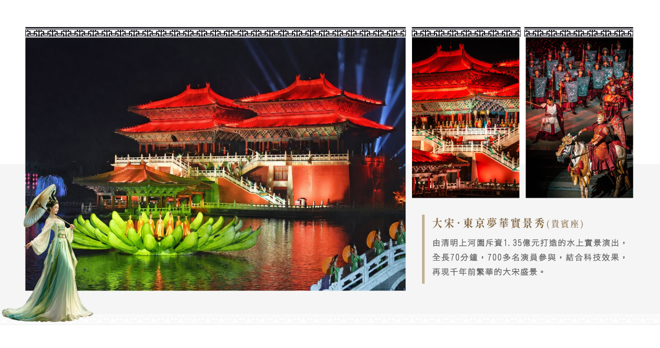 【大宋.東京夢華實景秀(貴賓座)】是由清明上河園景區耗資 1.35億元的大型水上實景演出,全劇共70分鐘,由700多名演員參與演出,整個演出運用大量的科技元素,製造出夢幻般的意境、回復千年前的繁華大宋帝國。
