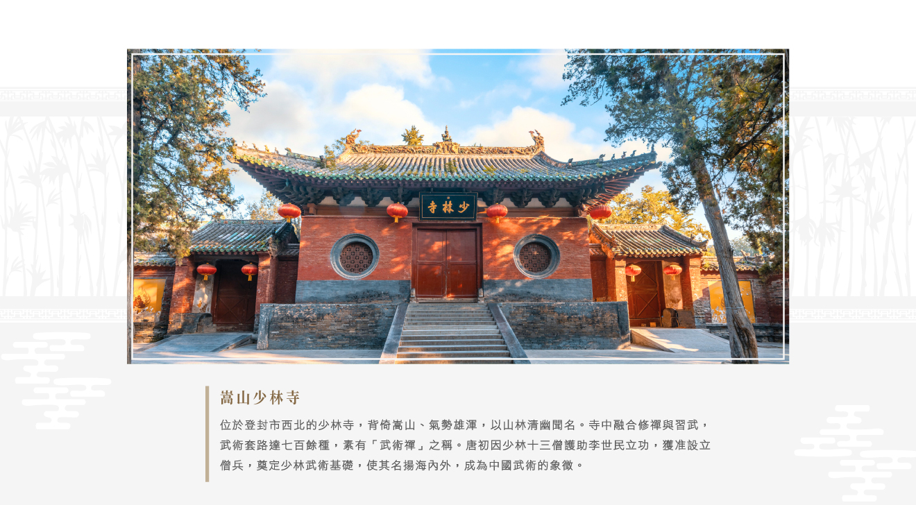 【嵩山少林寺】位於登封市西北,少林寺坐北向南,面對少室山,背靠五奇峰,少林寺像嵩山的一顆璀璨明珠,鑲嵌在太室山與少室山相接的山口,氣魄之大,山林之幽,令人嘆為觀止,武功套路高達七百種以上,習武修禪,又有「武術禪」之稱。唐初,少林寺十三僧人因幫助唐皇帝李世民討伐王世充有功,受到封賞,而被特別認可設立常備僧兵,因而成就少林武術的發展。少林寺因武藝高超,享譽海內外,少林一詞也成為漢族傳統武術的象徵。