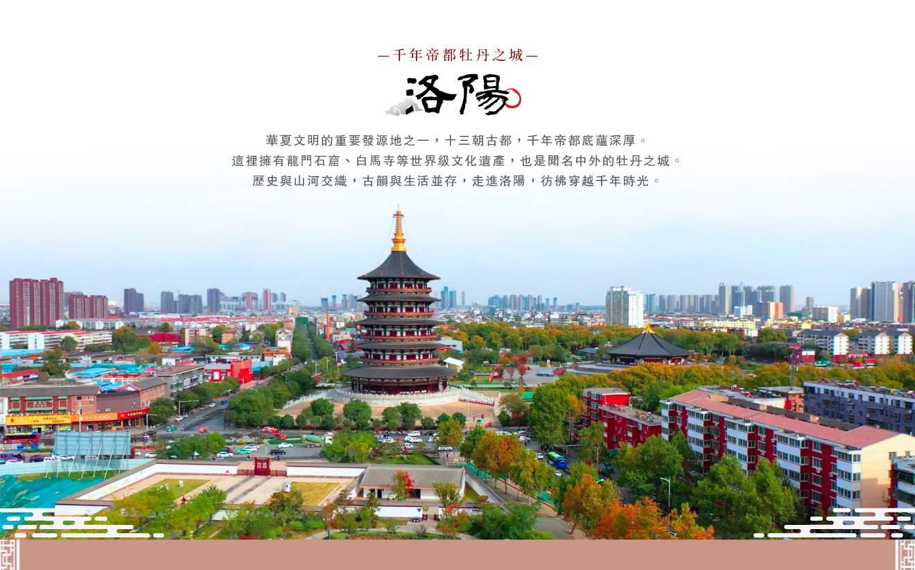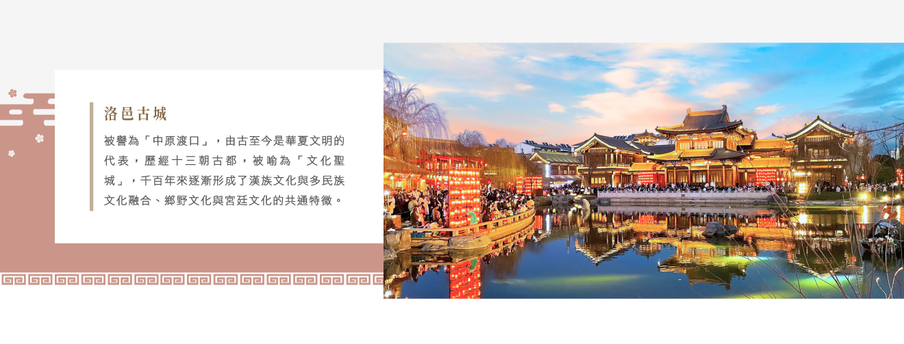 【洛邑古城】被譽為「中原渡口」,由古至今是華夏文明的代表,歷經十三朝古都,被喻為「文化聖城」,千百年來逐漸形成了漢族文化與多民族文化融合、鄉野文化與宮廷文化的共通特徵。