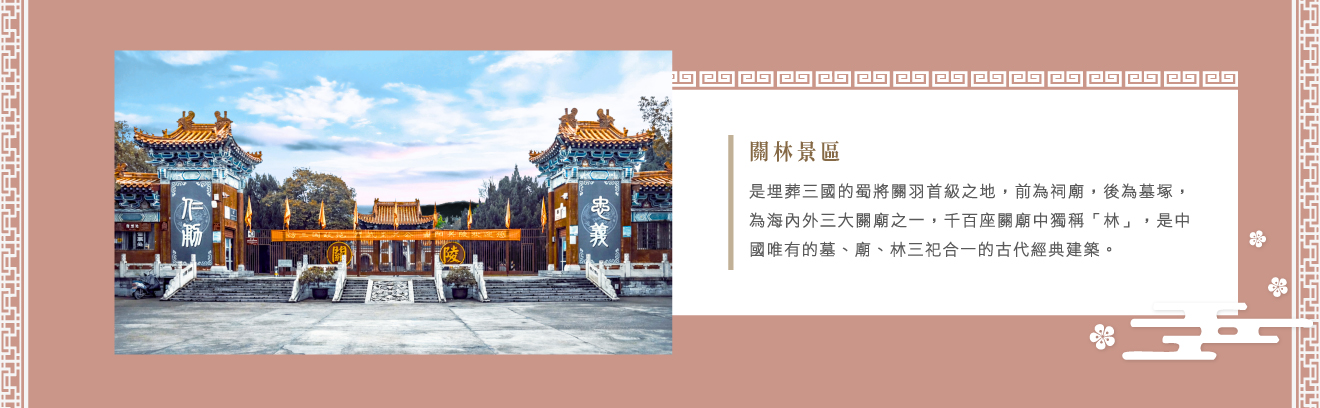 【關林景區】是埋葬三國的蜀將關羽首級之地,前為祠廟,後為墓塚,為海內外三大關廟之一,千百座關廟中獨稱「林」,是中國唯有的墓、廟、林三祀合一的古代經典建築。