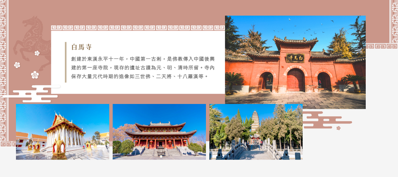 【白馬寺】位於洛陽老城以東,創建於東漢永平十一年,中國第一古剎,是佛教傳入中國後興建的第一座寺院,以中國佛教的「祖庭」和「釋源」之稱。現存的遺址古蹟為元、明、清時所留。寺內保存大量元代時期的造像如三世佛、二天將、十八羅漢等。