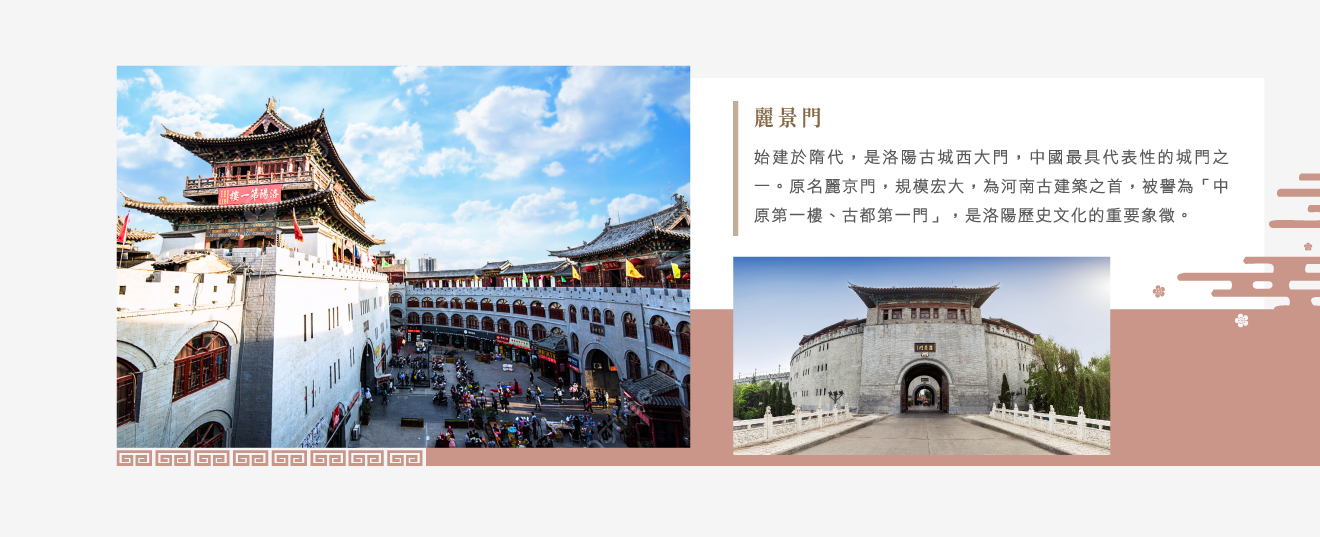 【麗景門】是中國歷史上最典型、最優秀的城門,最早始建於隋代,是洛陽古城的西大門。原名稱為麗京門,其規模之宏大在河南古建築中居於首位,成為洛陽古城歷史文化最具特色的標誌,為中原第一樓,古都第一門。