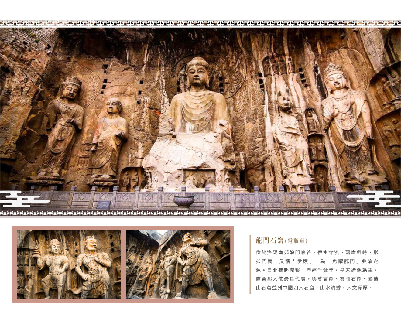 【龍門石窟】位於洛陽市南郊,龍門峽谷東西兩崖的峭壁間。因為東、西兩山對峙,伊水從中流過,看上去宛若門厥,所以又被稱為「伊厥」,據傳大禹開鑿的龍門山,就是現在龍門石窟的所在地,也是「魚躍龍門」的典故發源地。自北魏至清末,歷經10餘個朝代長達1400年的修建,,石窟造像多為皇家貴族所建,建造時採用了大量彩繪,今多已褪色,一代女皇武則天就是根據自己容貌,於此雕刻了最富盛名的盧舍那大佛;龍門石窟與莫高窟、雲岡石窟、麥積山石窟並稱中國四大石窟,這裡地處交通要衝,且山清水秀,氣候宜人,自古吸引文人墨客絡繹於途。