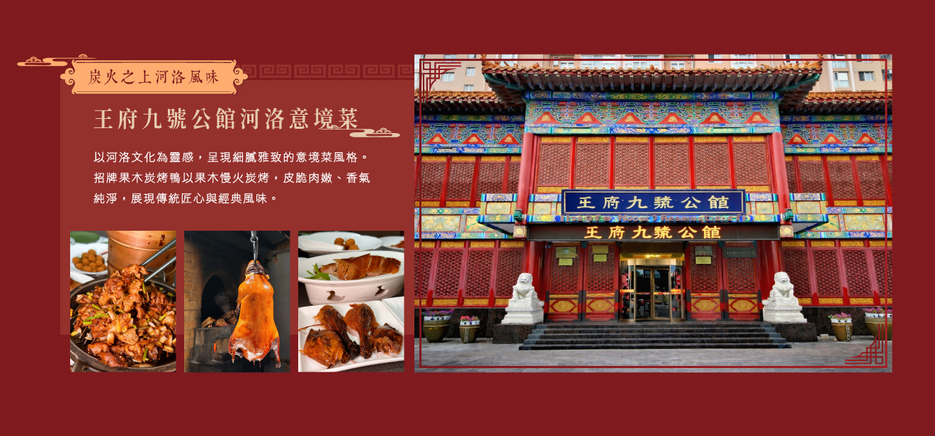 早餐:酒店內 午餐:特別安排欒川宴天下中式料理 晚餐:特別安排王府九號公館河洛意境菜+果木炭烤鴨