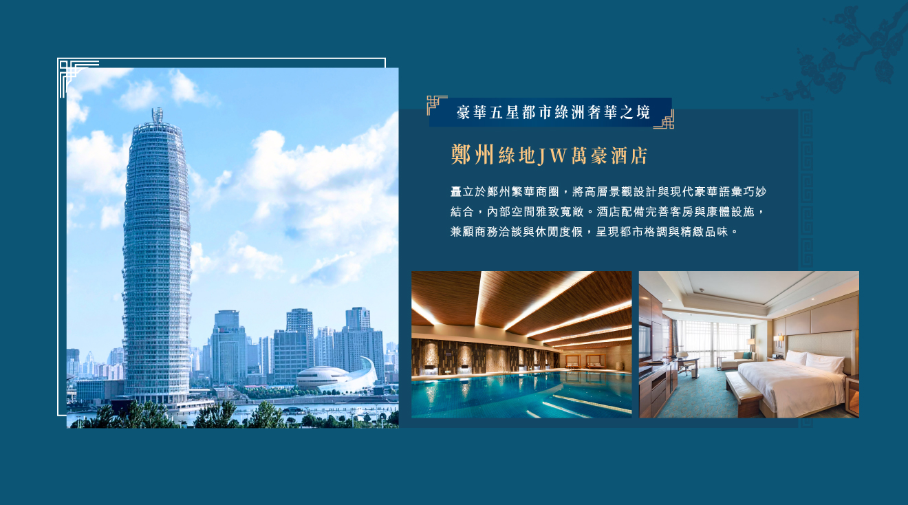 住宿豪華五星級鄭州綠地JW萬豪酒店 或 富力萬達文華飯店 或同等級