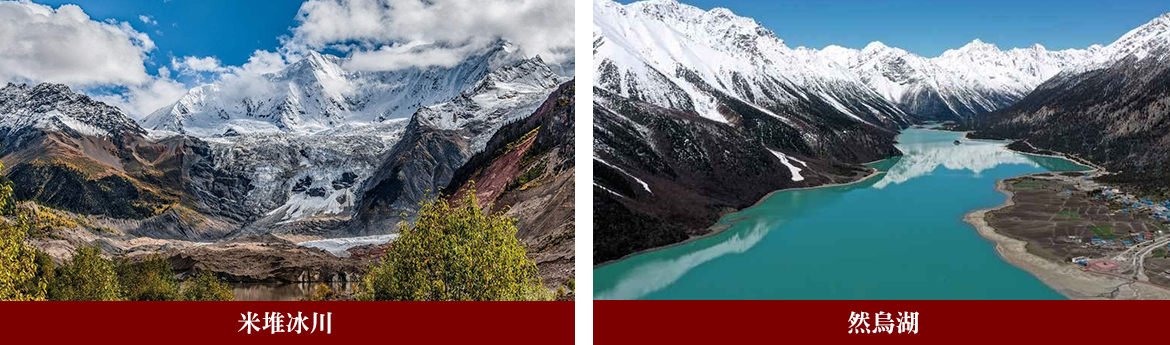 【然烏湖】湖泊是由高山滑坡、泥石流堵塞河道而形成堰塞湖,湖面海拔約3,850公尺,面積22平方公里,周圍主要為崗日嘎布山脈和來古冰川群,湖水以湛藍幽靜而聞名,隨季節不同會呈現碧綠、碧藍、青綠等顏色,蔥鬱森林、巍峨雪山倒影其中,美不勝收。