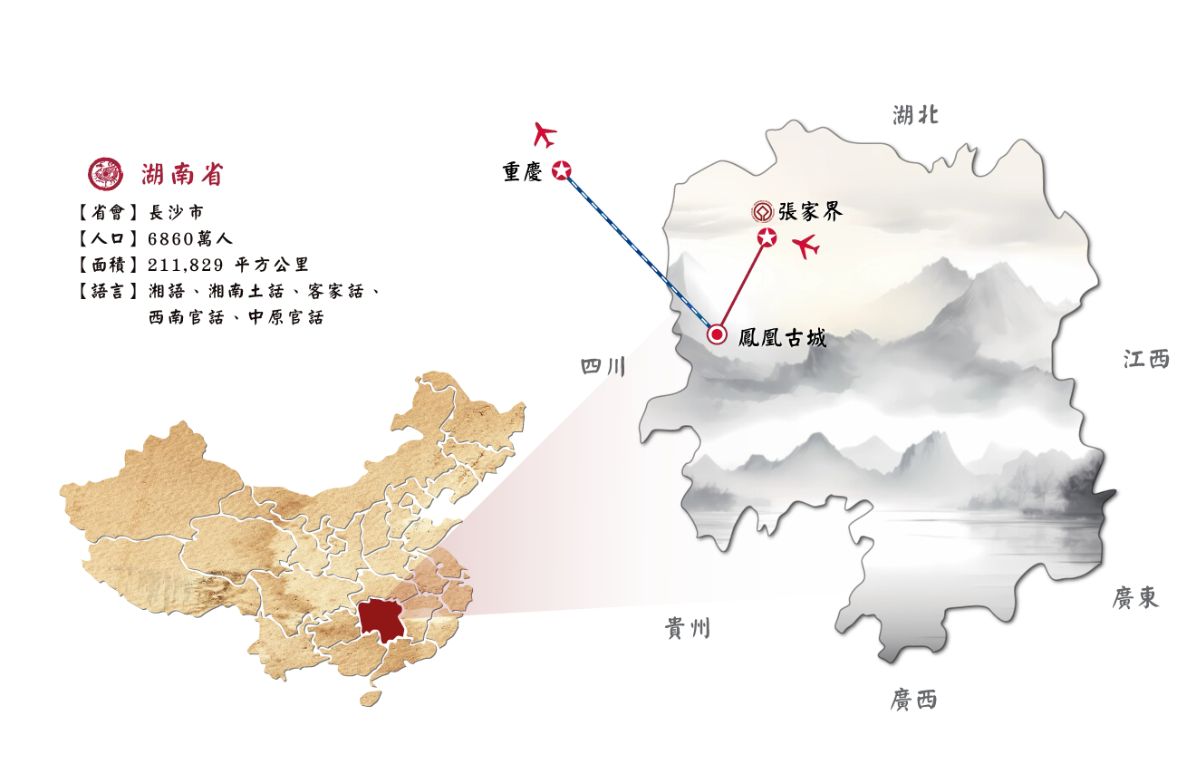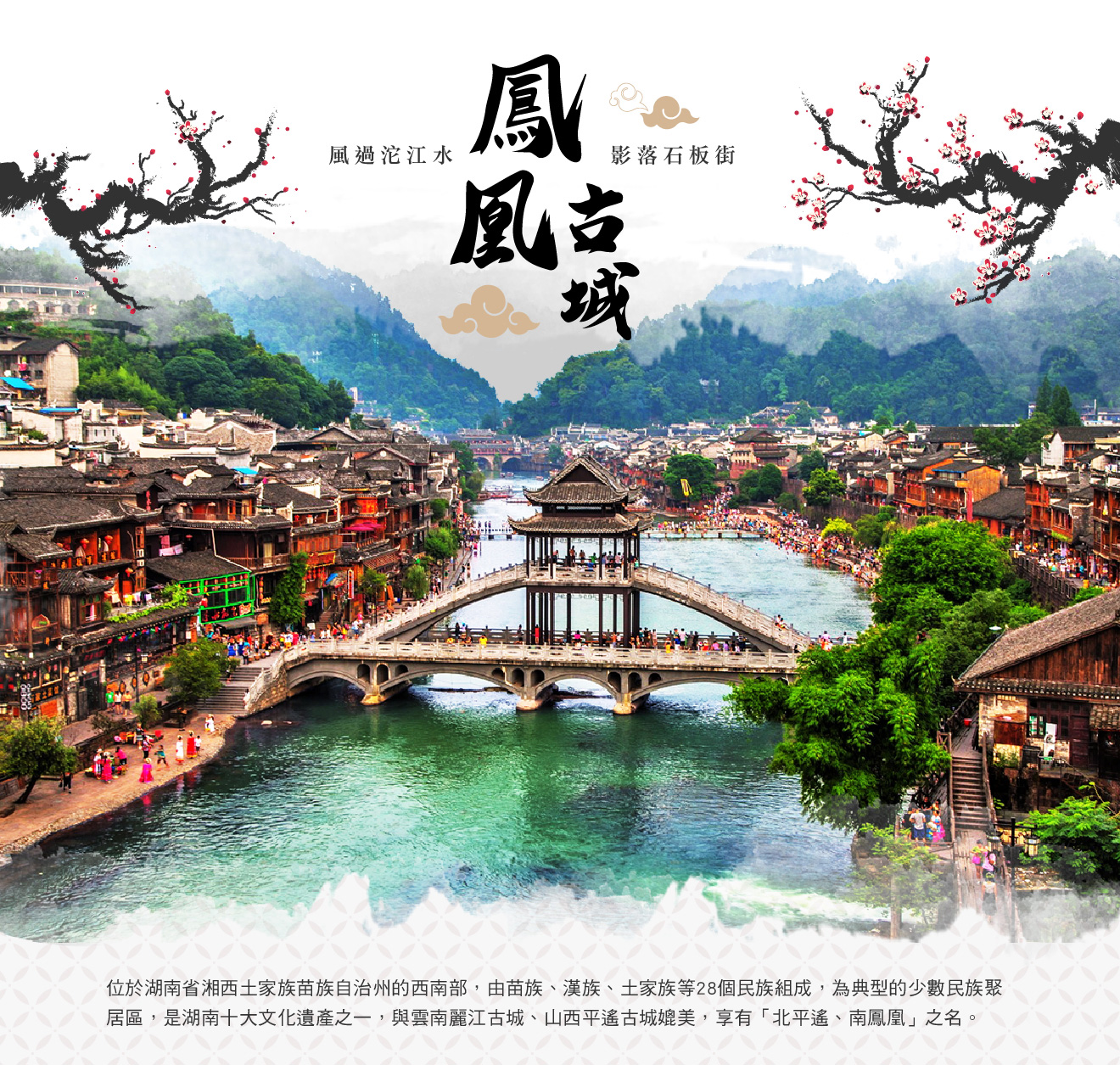 【鳳凰古城】位於湖南省湘西土家族苗族自治州的西南部,土地面積約10平方公里,人口約5萬人,由苗族、漢族、土家族等28個民族組成,為典型的少數民族聚居區,古城建於清康熙四十三年(1704年),是湖南十大文化遺產之一,曾被紐西蘭作家路易·艾黎稱讚為「中國最美麗的小城」,與雲南麗江古城、山西平遙古城媲美,享有「北平遙、南鳳凰」之名。