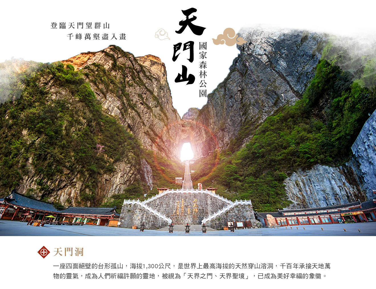 【天門洞】一座四面絕壁的台形孤山,海拔1,300公尺,門高131.5公尺,寬57公尺,深60公尺,是世界上最高海拔的天然穿山溶洞,千百年承接天地萬物的靈氣,成為人們祈福許願的靈地,被視為「天界之門、天界聖境」,已成為美好幸福的象徵;宛若一道通天的門戶;這一勝景,吸引隱賢逸士、文人墨客前來探訪遊賞,歷經世代累積,形成了天門山獨特厚重的「天文化」;其「天門吐霧」、「天門霞光」被譽為舉世罕見的景象奇觀。