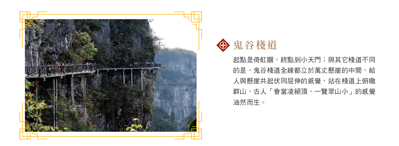 【鬼谷棧道】起點是倚虹關,終點到小天門;與其它棧道不同的是,鬼谷棧道全線不在懸崖之巔,也不在懸崖之側,而是全線都立於萬丈懸崖的中間,給人與懸崖共起伏同屈伸的感覺,站在棧道上俯瞰群山,古人「會當凌絕頂,一覽眾山小」的感覺油然而生;棧道全長1,600公尺,平均海拔為1,400公尺,站在這裡,腳下是沒有邊際的綠野,雙腿會不由自主的發麻。