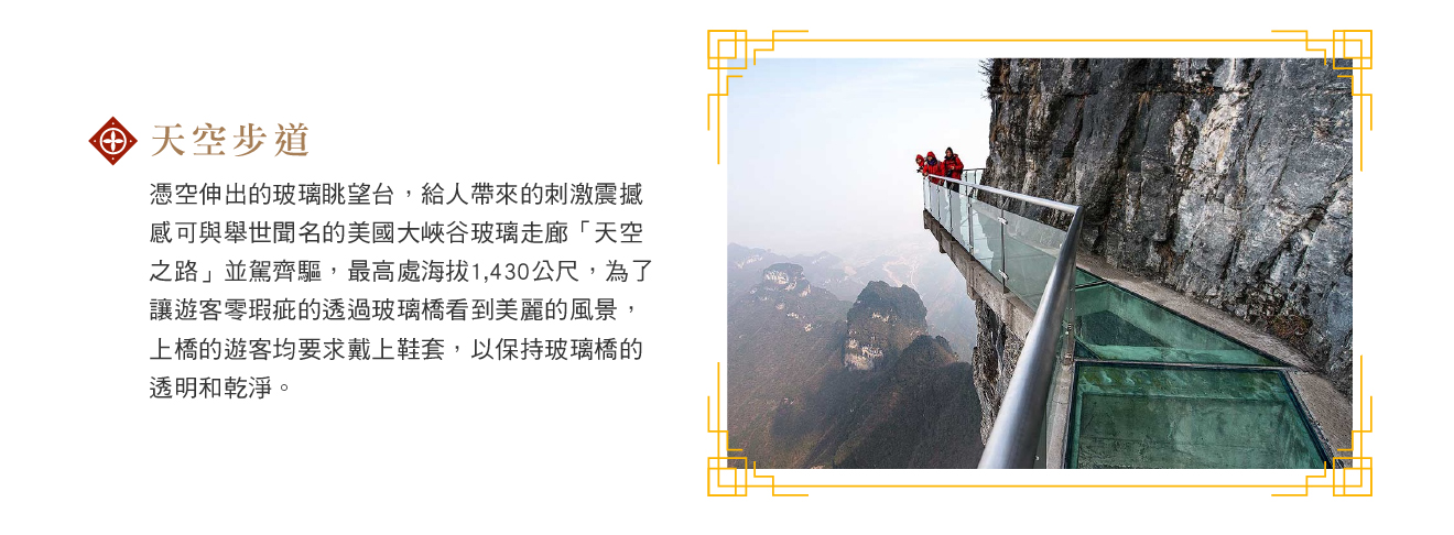 【天空步道.含鞋套】於2011年10月1日正式對遊客開放,是憑空伸出的玻璃眺望台,給人帶來的刺激震撼感可與舉世聞名的美國大峽谷玻璃走廊「天空之路」並駕齊驅,長60公尺,最高處海拔1430公尺,為了讓遊客零瑕疵的透過玻璃橋看到美麗的風景,上橋的遊客均要求戴上鞋套,以保持玻璃橋的透明和乾淨。