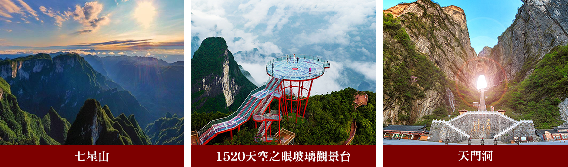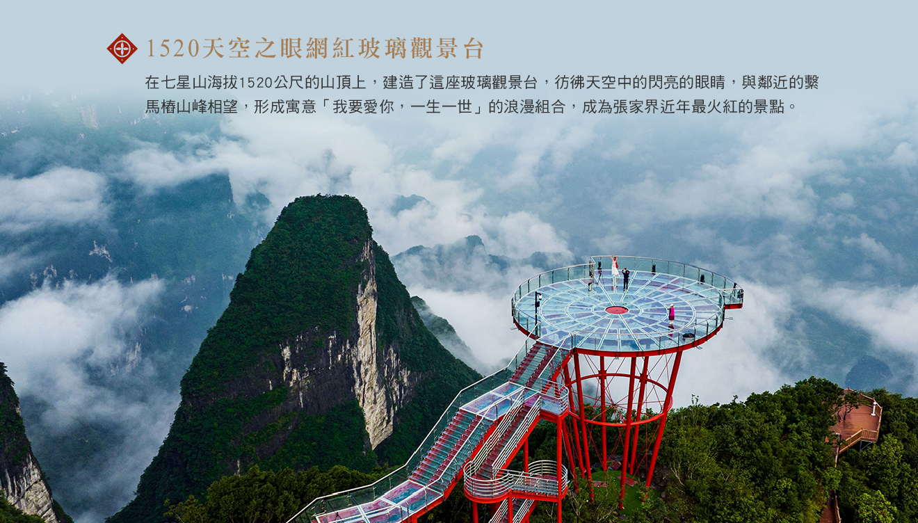 【1520天空之眼網紅玻璃觀景台】在七星山海拔1520公尺的山頂上,建造了這座玻璃觀景台,彷彿天空中的閃亮的眼睛,與鄰近海拔1314公尺的繫馬樁山峰相望,形成寓意「我要愛你,一生一世」的浪漫組合,成為張家界近年最火紅的景點。