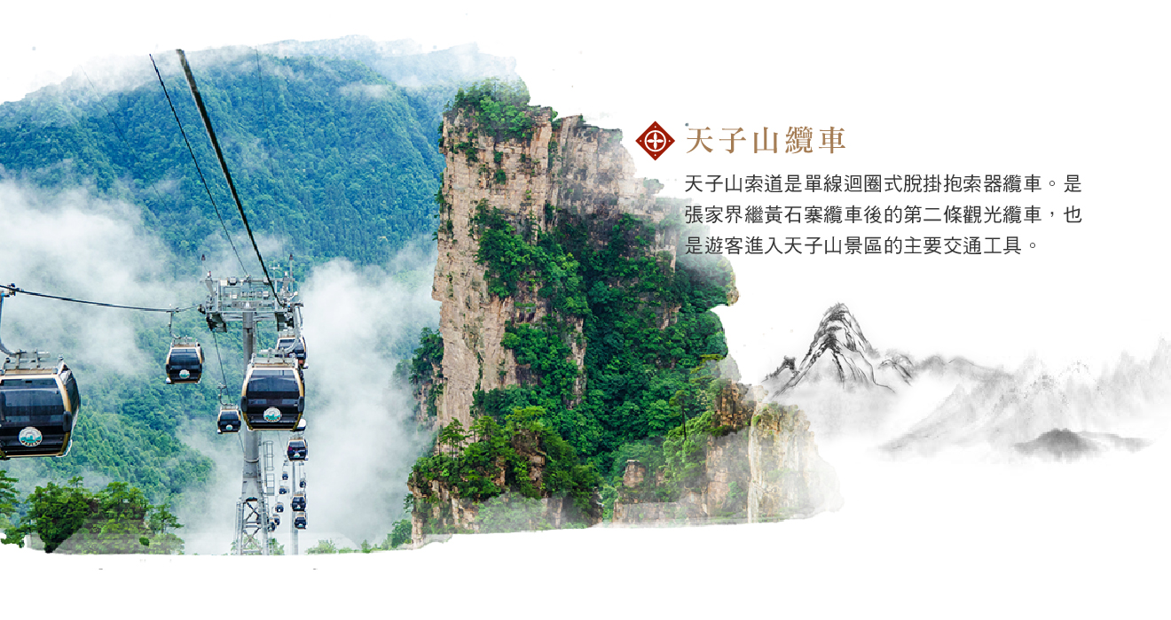 【天子山纜車】張家界繼黃石寨纜車後的第二條觀光纜車,也是進入天子山景區的主要交通工具,是單線迴圈式脫掛抱索器客運索道,全部設備自奧地利進口,索道全長2084公尺,上下高差692公尺,配有封閉式觀光吊廂38個,“誰人識得天子山,歸來不看天下山”,索道開通後,大大改善了武陵源風景區旅遊交通環境,使遊人花極少時間便可盡覽這“擴大的盆景,縮小的仙境”迷人景色。