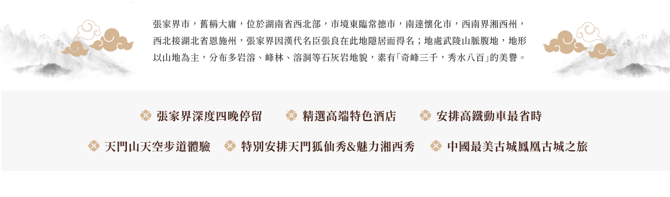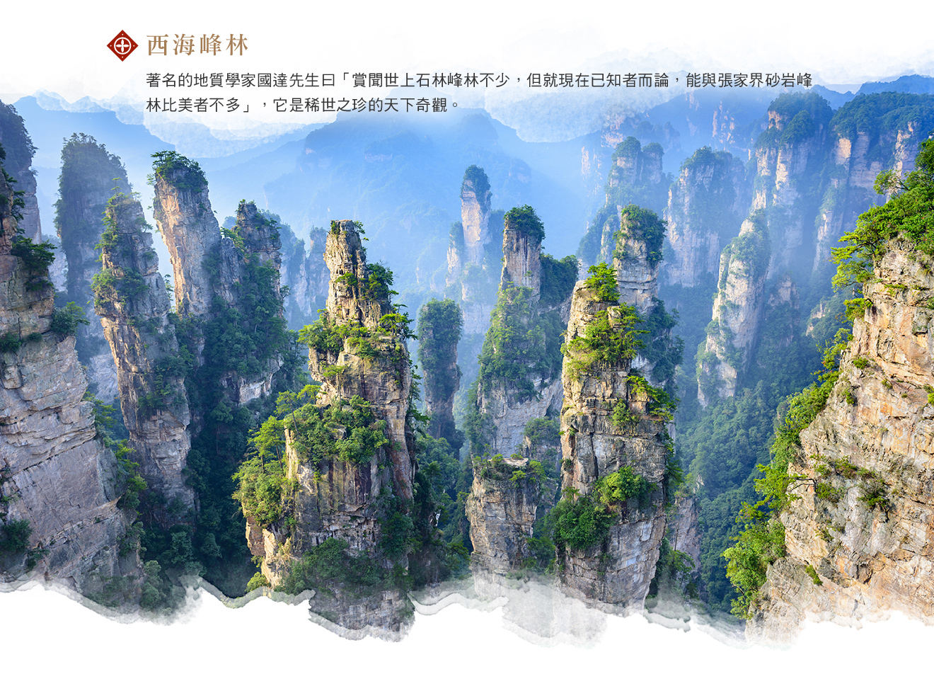 【張家界】原名“大庸”,位於湖南省西北部,澧水中上游,屬武陵山區腹地,被譽為“擴大的盆景,縮小的仙境”;1982年9月,張家界成為中國第一個國家森林公園,1992年,由張家界國家森林公園等三大景區構成的武陵源風景名勝區被聯合國教科文組織列入《世界自然遺產名錄》;2004年被列入全球首批《世界地質公園》;2007年,被列入中國首批國家5A級旅遊景區;地層複雜多樣,造化了當地的特色景觀。主要有山地、岩溶、丘陵、崗地和平原等,山地面積占總面積的76%,其中最具特色的是石英砂岩峰林地貌,為世界罕見。