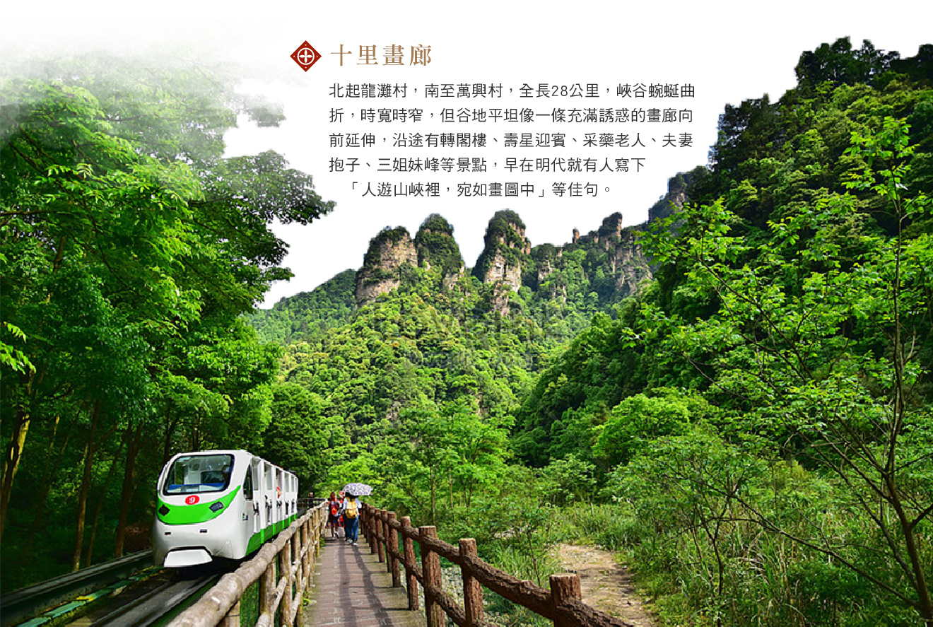 【十里畫廊】北起龍灘村,南至萬興村,全長28公里,峽谷蜿蜒曲折,時寬時窄,但谷地平坦像一條充滿誘惑的畫廊向前延伸,沿途有轉閣樓、壽星迎賓、采藥老人、夫妻抱子、三姐妹峰等景點,人行其間如在畫中,山上的岩石形成了似人似物、似鳥似獸的石景造型,早在明代就有人寫下「人遊山峽裡,宛如畫圖中」等佳句。
