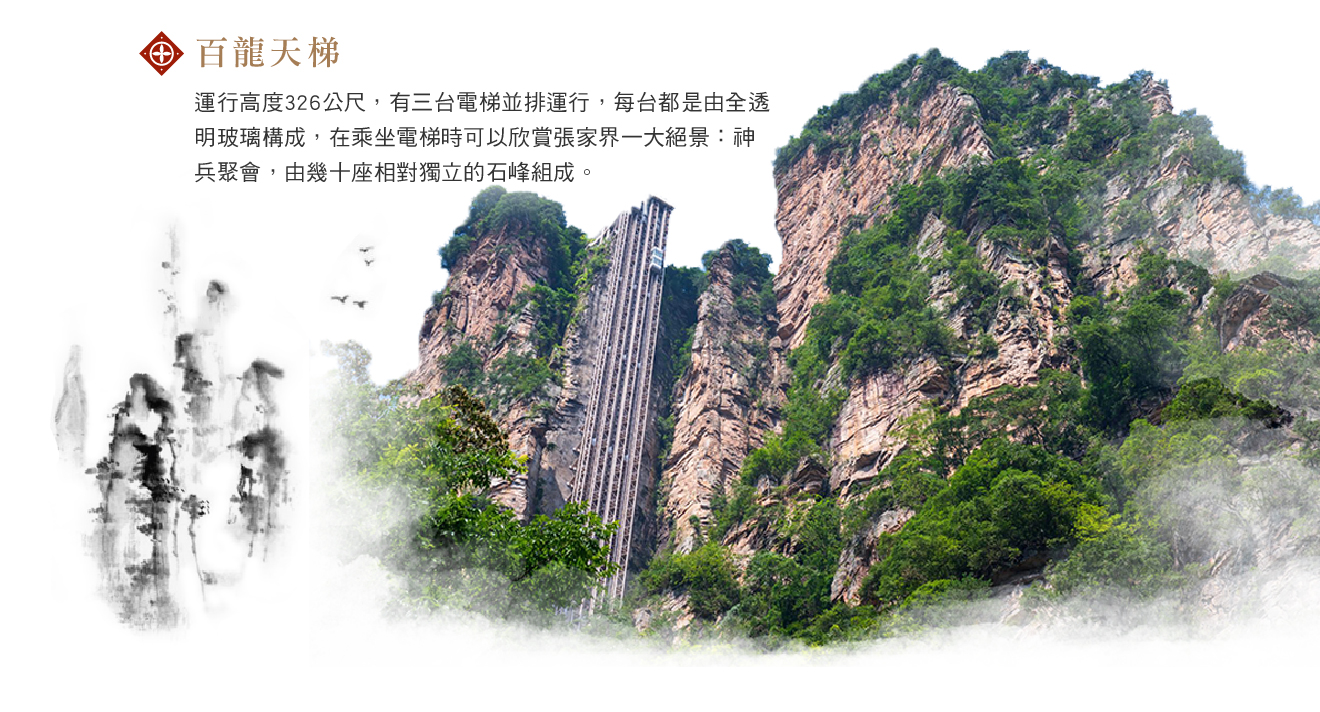 【百龍天梯VIP通道】運行高度326公尺,有三台電梯並排運行,每台都是由全透明玻璃構成,在乘坐電梯時可以欣賞張家界一大絕景:神兵聚會,由幾十座相對獨立的石峰組成。