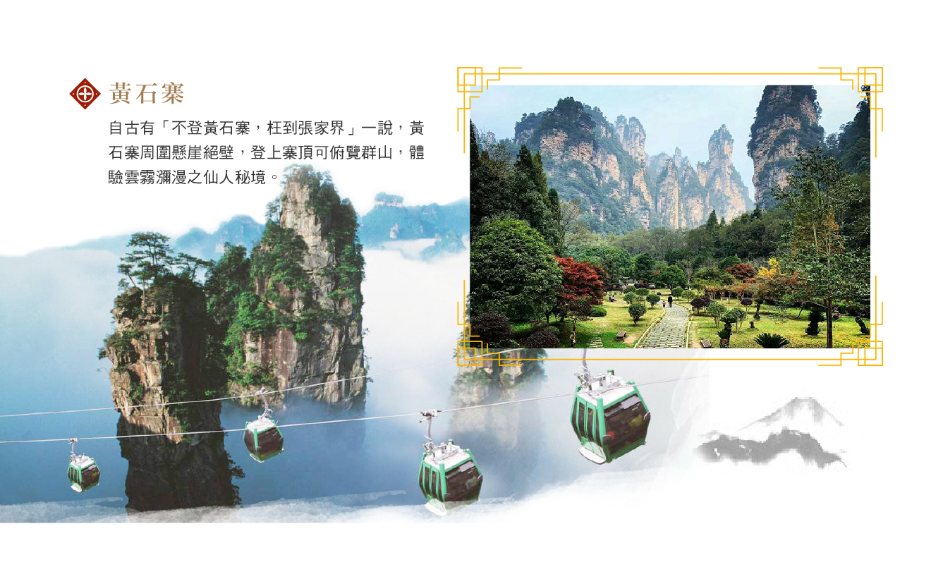 【黃石寨】相傳西漢留侯張良隱居時遭武陵太守索命圍堵,糧草告急之下,想起其師黃石公授予之兵法,智取武陵太守。後張良為了紀念此事,便把這座無名山寨取名為黃石寨。黃石寨是張家界景區的精華,自古有「不登黃石寨,枉到張家界」一說,黃石寨周圍懸崖絕壁,登上寨頂可俯覽群山,體驗雲霧瀰漫之仙人秘境。