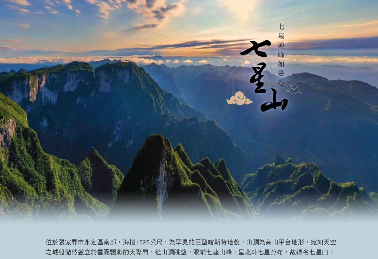 【七星山】位於張家界市永定區南部,海拔1528公尺,為罕見的巨型喀斯特地貌,山頂為高山平台地形,宛如天空之城般傲然聳立於雲霧飄渺的天際間。從山頂眺望,眼前七座山峰,呈北斗七星分布,故得名七星山。