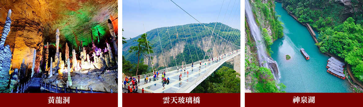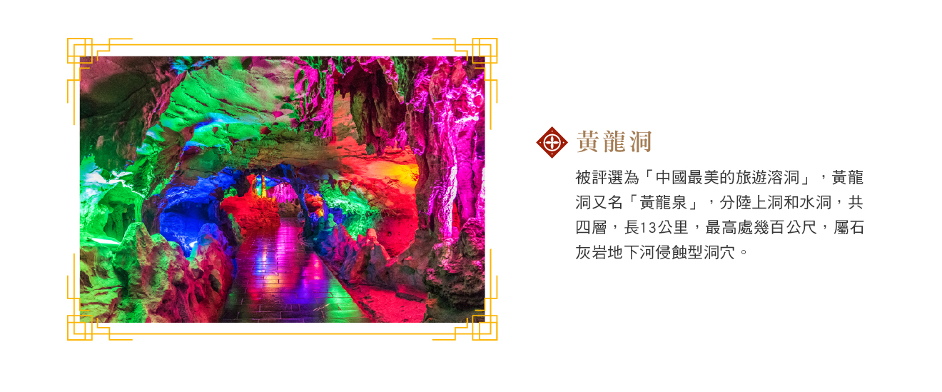 【黃龍洞】2009年被評選為「中國最美的旅遊溶洞」,黃龍洞又名「黃龍泉」,分陸上洞和水洞,共四層,長13公里,最高處幾百公尺,屬石灰岩地下河侵蝕型洞穴,兩層水洞與陸上洞上下縱橫,形成洞下有洞,樓上樓的螺旋結構,最大洞廳可容納上萬人,洞內有一個水庫、兩條地下河、三條地下瀑布、四個水潭、十三個大廳、九十六條遊廊;洞內流痕、邊石、倒石芽、倒鍋狀窩穴階段發育良好,穹頂石壁滴水沉澱的石乳、石柱、石筍、石幔、石琴、石花,如水晶玉石,琳琅滿目,美不勝收。