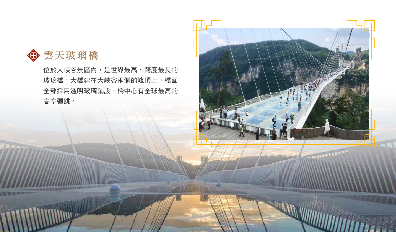 【雲天渡玻璃橋、尋寶電梯、滑道】位於大峽谷景區內,是世界最高、跨度最長的玻璃橋,大橋建在大峽谷兩側的峰頂上,橋面全部採用透明玻璃鋪設,橋中心有全球最高的高空彈跳。站在橋上,腳下400公尺處的谷底全景盡收眼底,還能享受極限高空彈跳的驚險刺激;隨後以最省時省力方式搭乘尋寶電梯及乘坐滑道往下前行。
