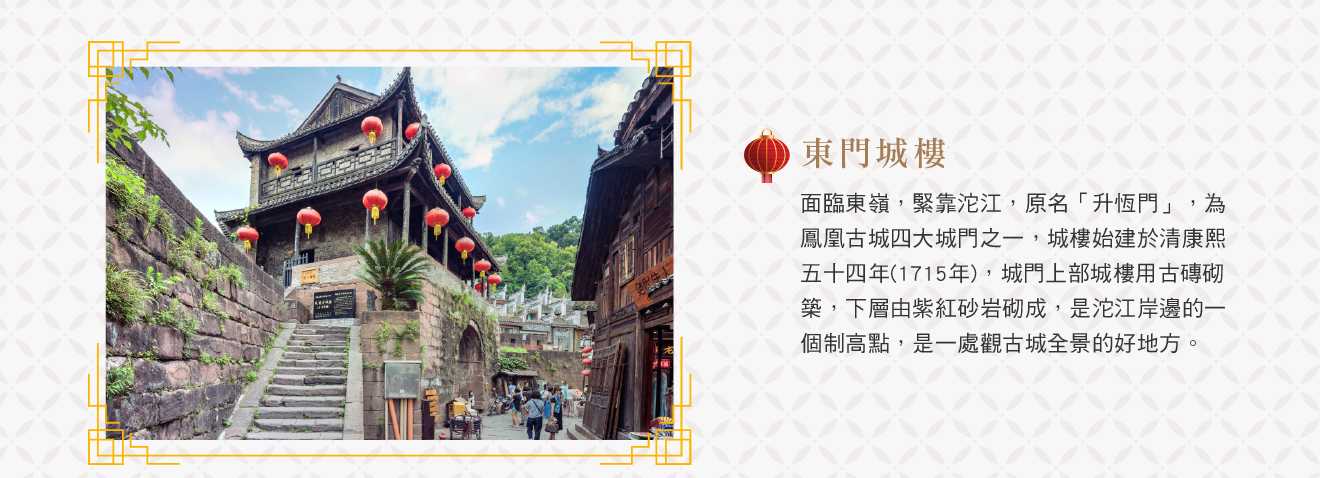 【東門城樓】面臨東嶺,緊靠沱江,莊嚴雄偉,原名「升恆門」,為鳳凰古城四大城門之一,與不遠處的北門城樓、南門城樓(南華門)曾一起護衛過這座美麗的山水小城,城樓始建於清康熙五十四年(1715年),城門上部城樓用古磚砌築,下層由紫紅砂岩砌成,是沱江岸邊的一個制高點,站在這裡,近觀樓底的古街市和腳下的潺潺沱江,遠望河兩岸的吊腳樓和青翠起伏的山巒,可謂是一處觀古城全景的好地方。