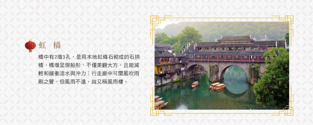 【虹橋】原名為臥虹橋,建於西元1670年,民國三年重修,改名虹橋,橋中有2墩3孔,是用本地紅條石砌成的石拱橋,橋墩呈現船形,不僅美觀大方,且能減輕和緩衝流水與沖力;原橋面兩側各建有12間吊腳樓木板房,開設飲食、百貨店鋪,中間為2公尺寬的人行長廊,長廊上方建有屋頂,行走廊中可聞風吹雨刷之聲,但風雨不進,故又稱風雨樓,站在橋上可盡收沱江兩岸如畫風景,是鳳凰古鎮中觀賞、攝影的最佳地之一。