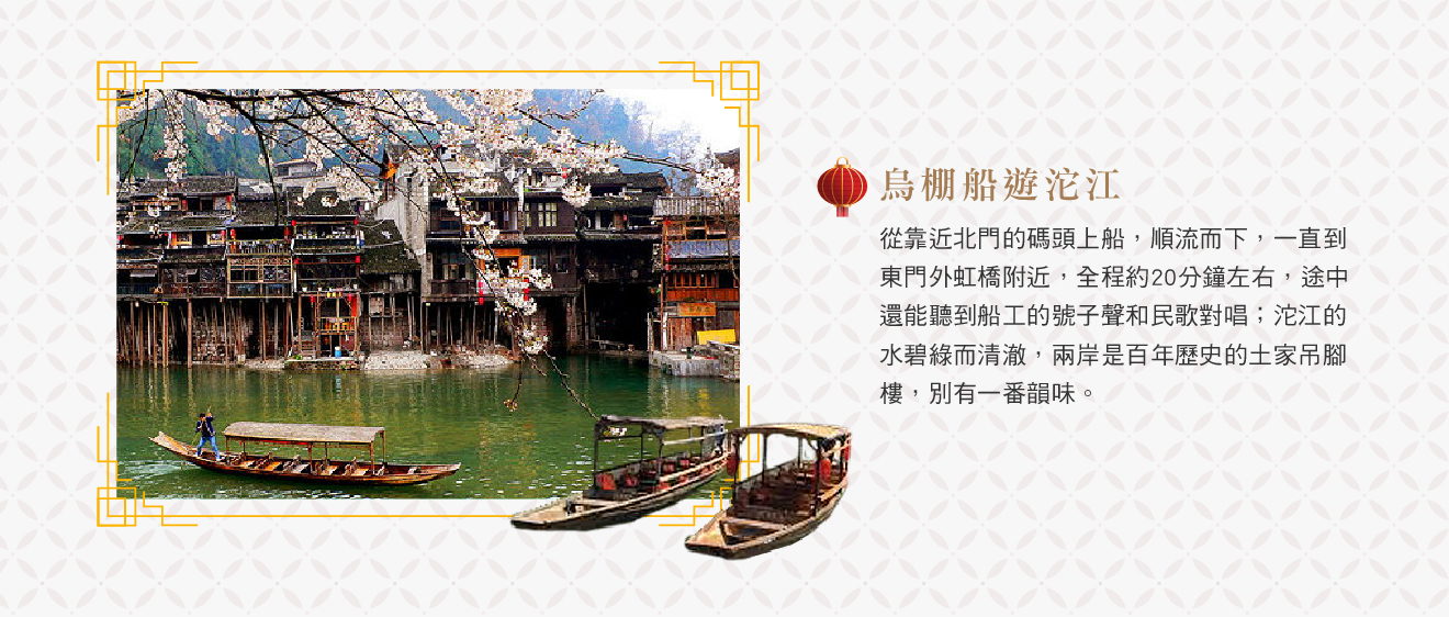 【烏棚船夜遊沱江】從靠近北門的碼頭上船,順流而下,一直到東門外虹橋附近,全程約20分鐘左右,途中還能聽到船工的號子聲和民歌對唱;沱江的水碧綠而清澈,兩岸是百年歷史的土家吊腳樓,別有一番韻味,沱江的南岸是用紫紅沙石砌成古城牆,城牆有東、北兩座城樓,久經滄桑依然壯觀。