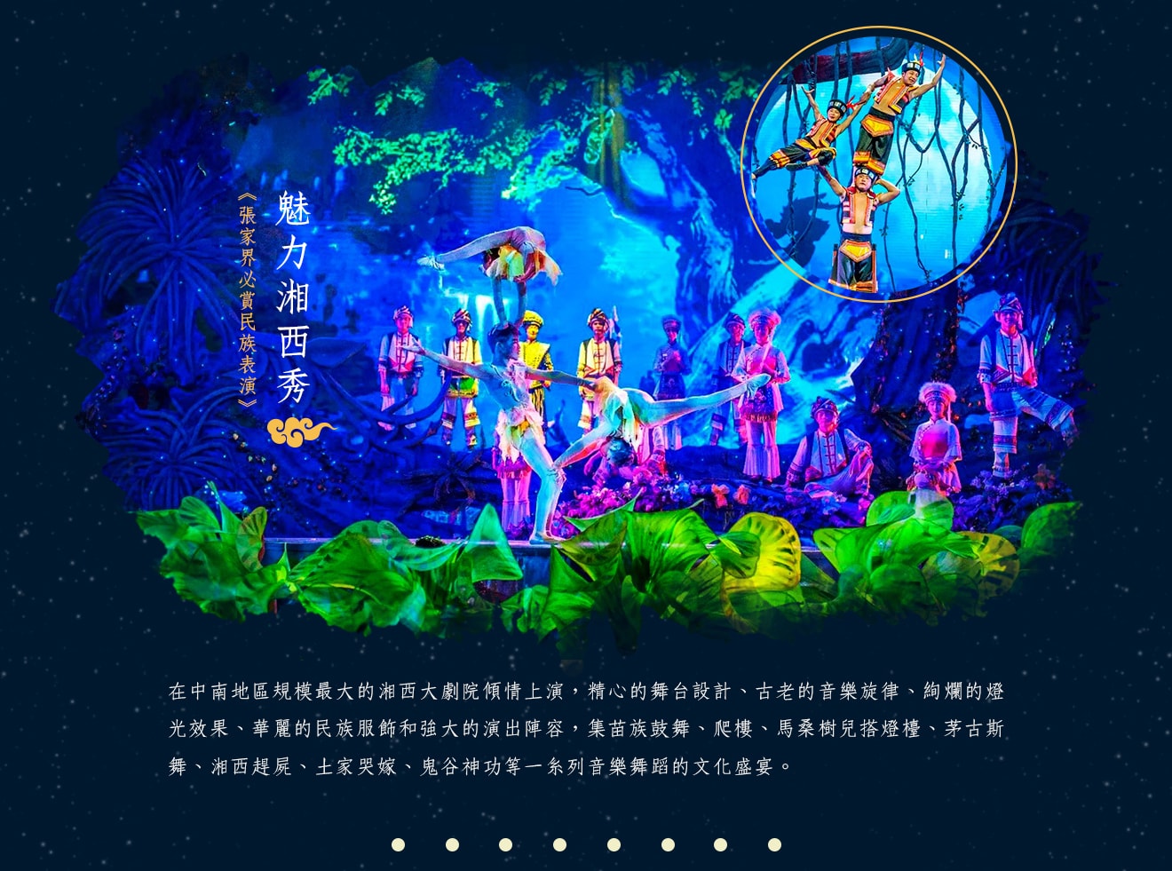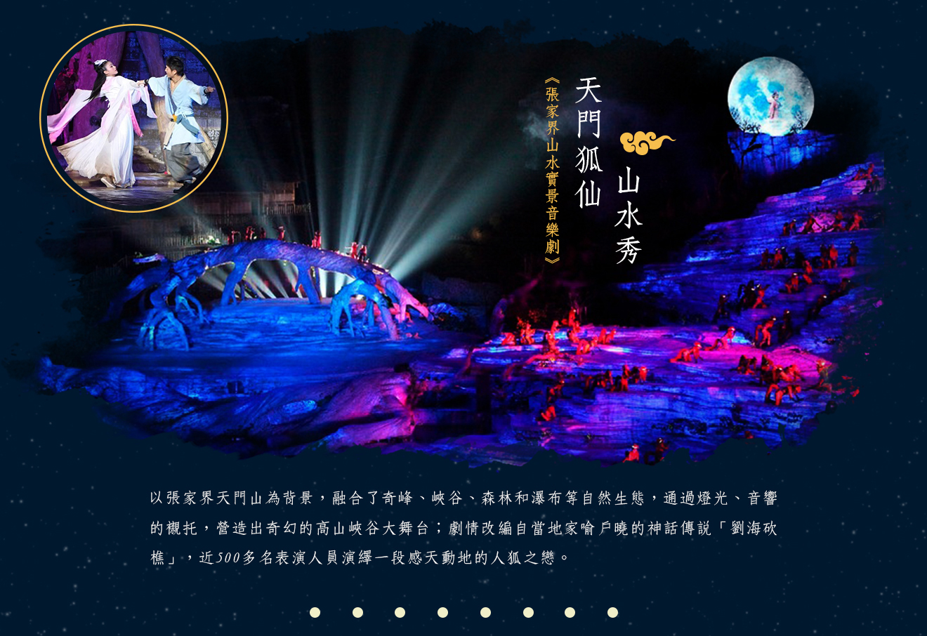 【天門狐仙秀】精彩絕倫的山水實景音樂劇,以張家界天門山為背景,融合了奇峰、峽谷、森林和瀑布等自然生態,通過燈光、音響的襯托,營造出奇幻的高山峽谷大舞台;劇情改編自當地家喻戶曉的神話傳說「劉海砍樵」,近500多名表演人員演繹一段感天動地的人狐之戀,動人的音樂旋律下,更加入了漫天飛雪、高空飛橋等諸多特效場景,伴隨著燈光的色彩變換,呈現一場氣勢磅礴的視聽盛宴!