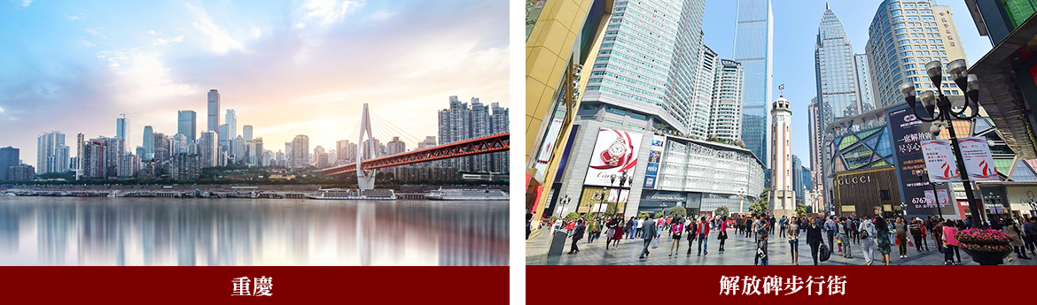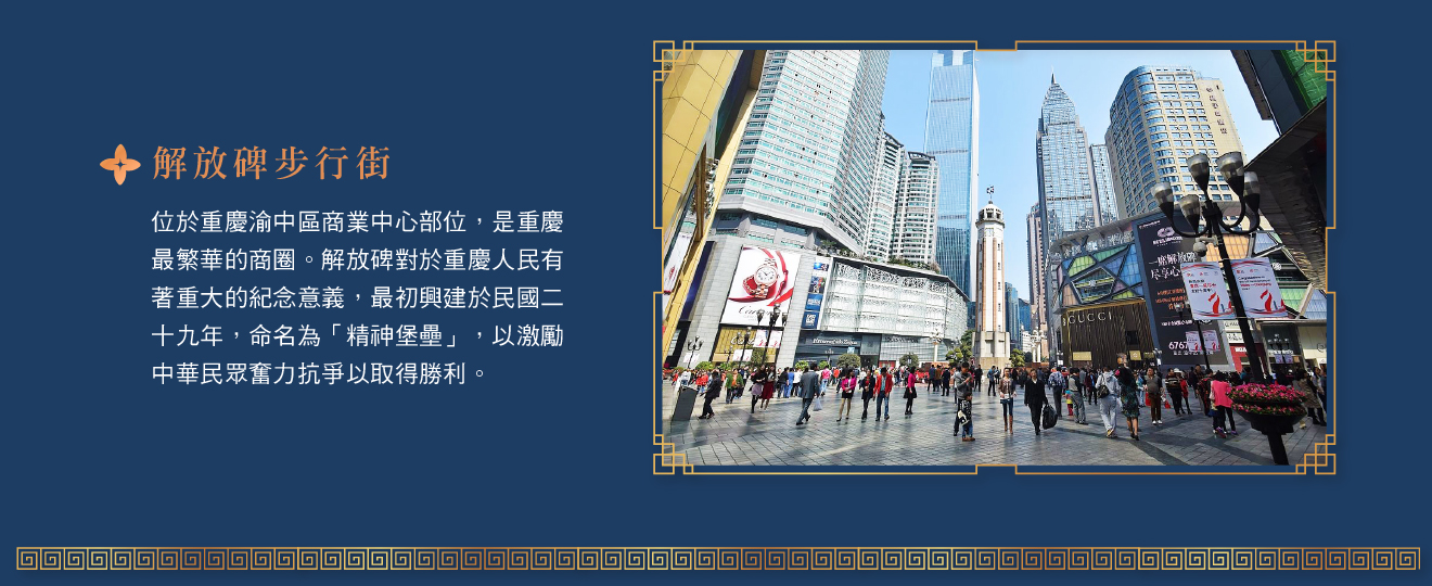 【解放碑步行街】位於重慶渝中區商業中心部位,是重慶最繁華的商圈。解放碑對於重慶人民有著重大的紀念意義,它最初興建於民國二十九年,命名為「精神堡壘」,以激勵中華民眾奮力抗爭以取得勝利;抗戰勝利後改名為「抗戰勝利紀功碑」。1950年由劉伯承改題「重慶人民解放紀念碑」,記錄著重慶的歷史與文化,承載著重慶過去和未來的榮耀。