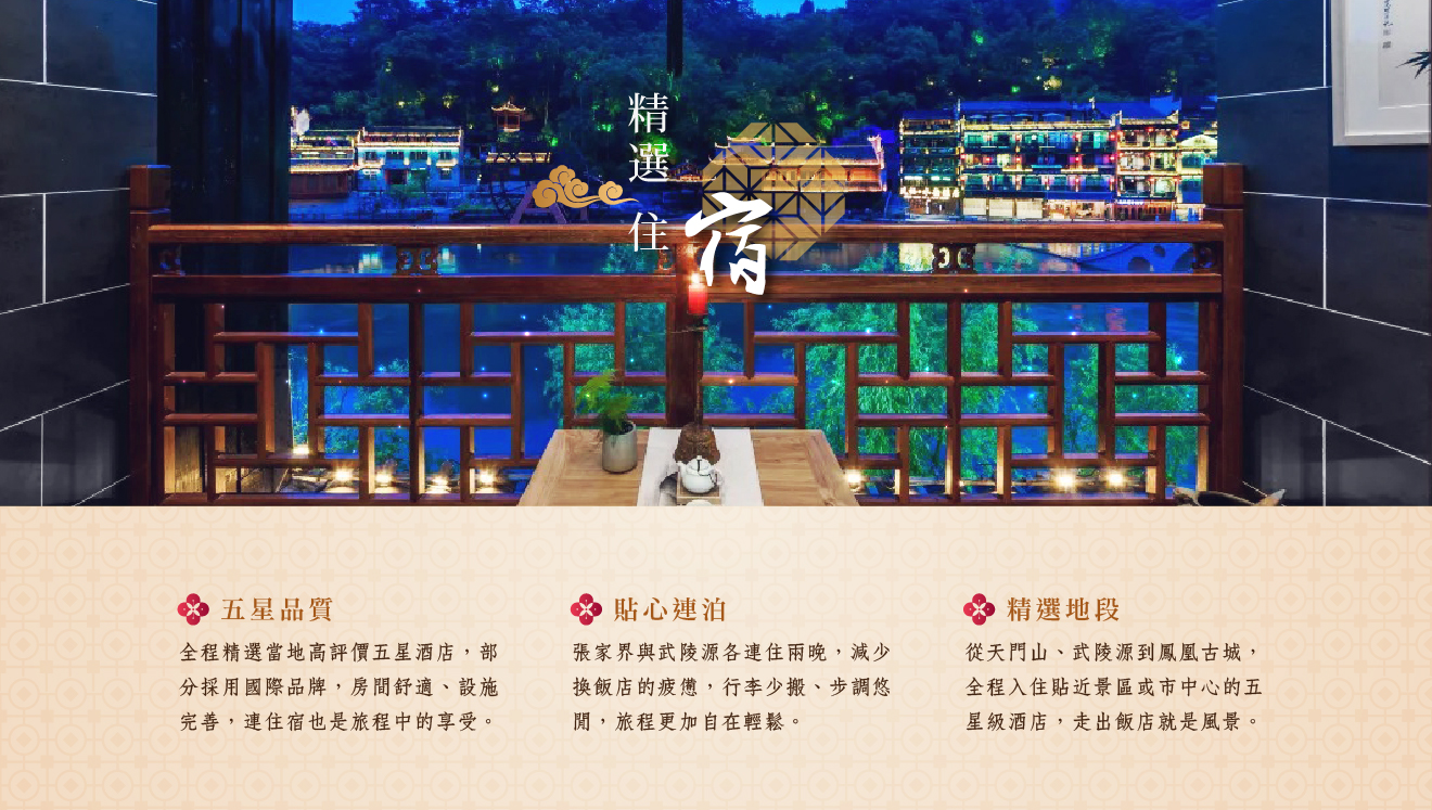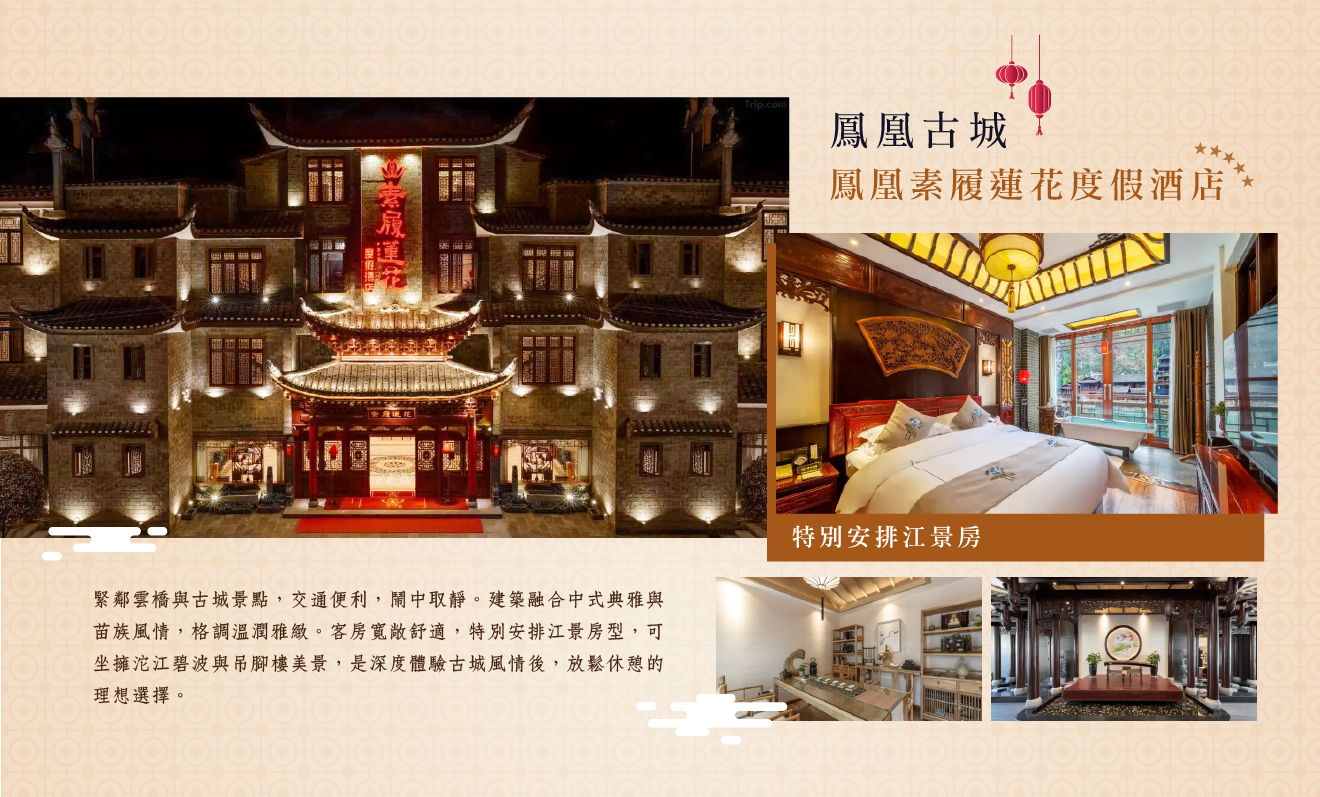 住宿:古城區豪華五星級沱江畔鳳凰素履蓮花度假酒店江景房 或 鳳凰堂舍·見山飯店 或 城郊豪華五星級鳳凰鳳仙境溫德姆至尊豪廷酒店 或同等級