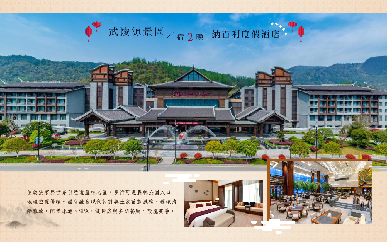住宿:武陵源景區2晚豪華五星級納百利度假酒店 或 京武鉑爾曼酒店 或同等級