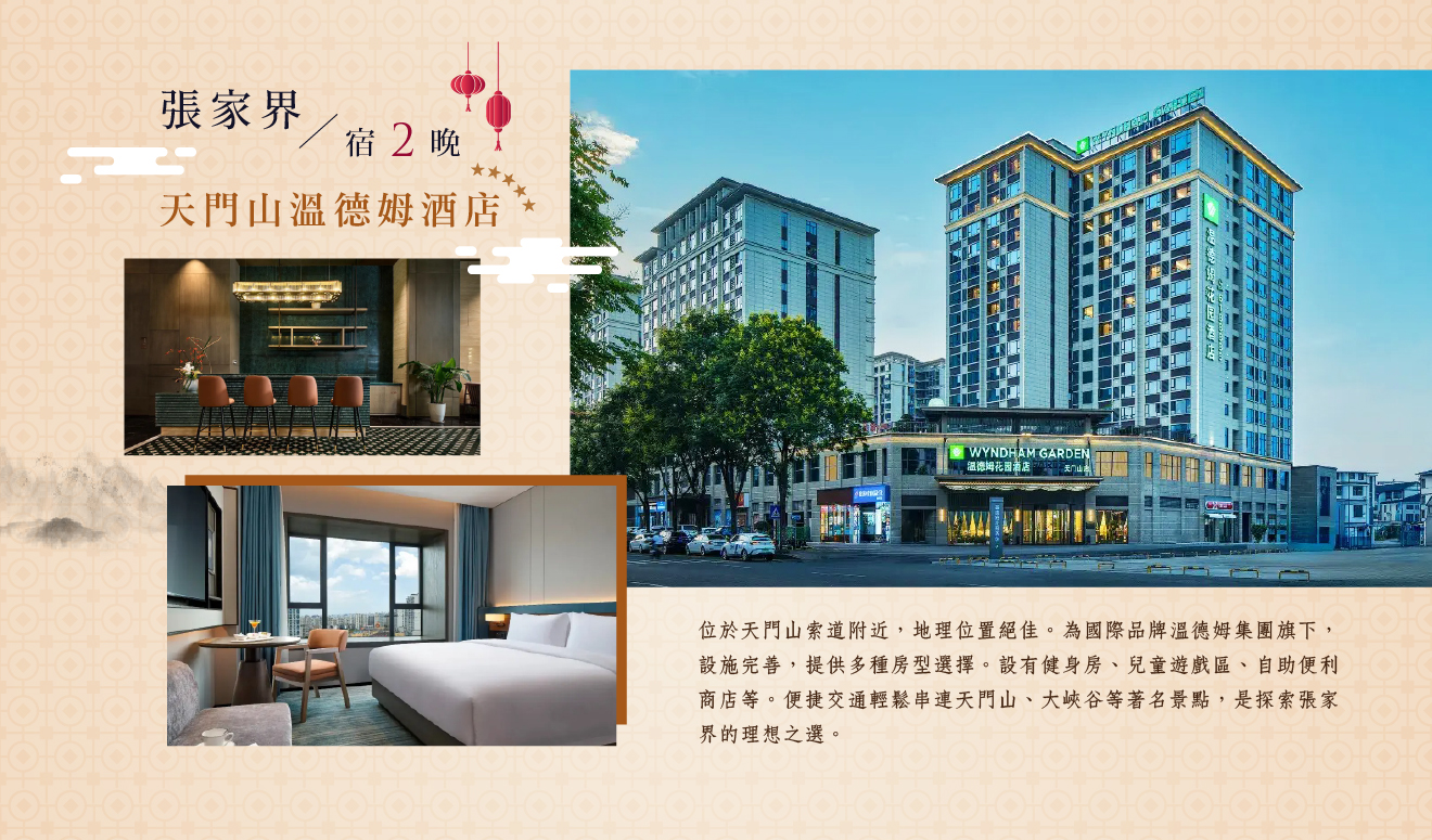 住宿:2晚五星級天門山溫德姆酒店或天門山希爾頓花園飯店 或同等級