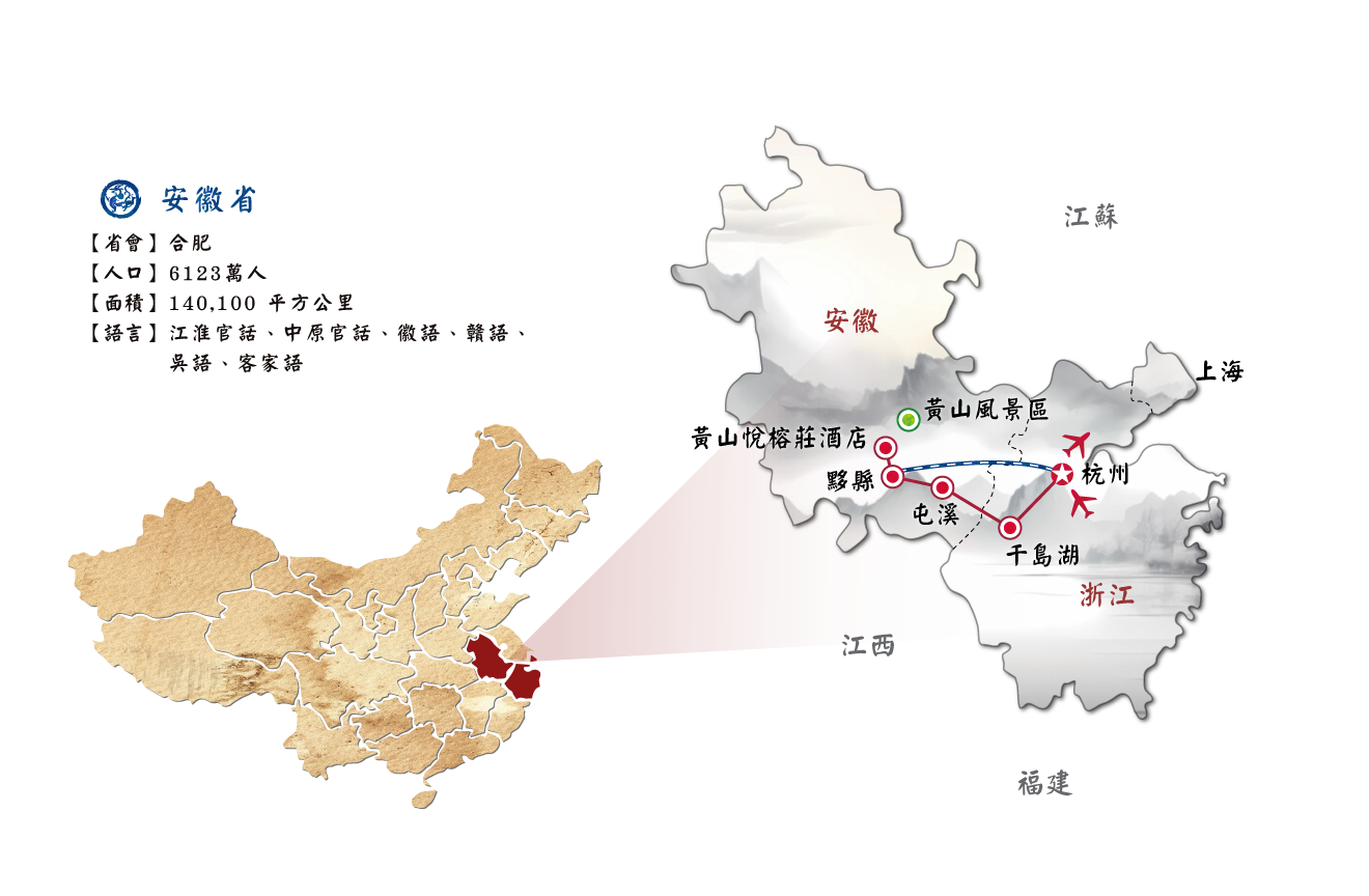 千島湖~船遊中心湖區、梅峰島(含纜車上下)、天嶼山觀景台 (含扶梯上山、區間車下山) 110km屯溪~夜遊黎陽in巷