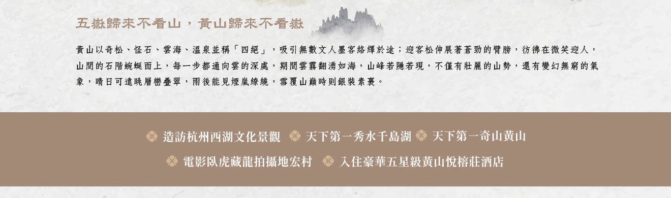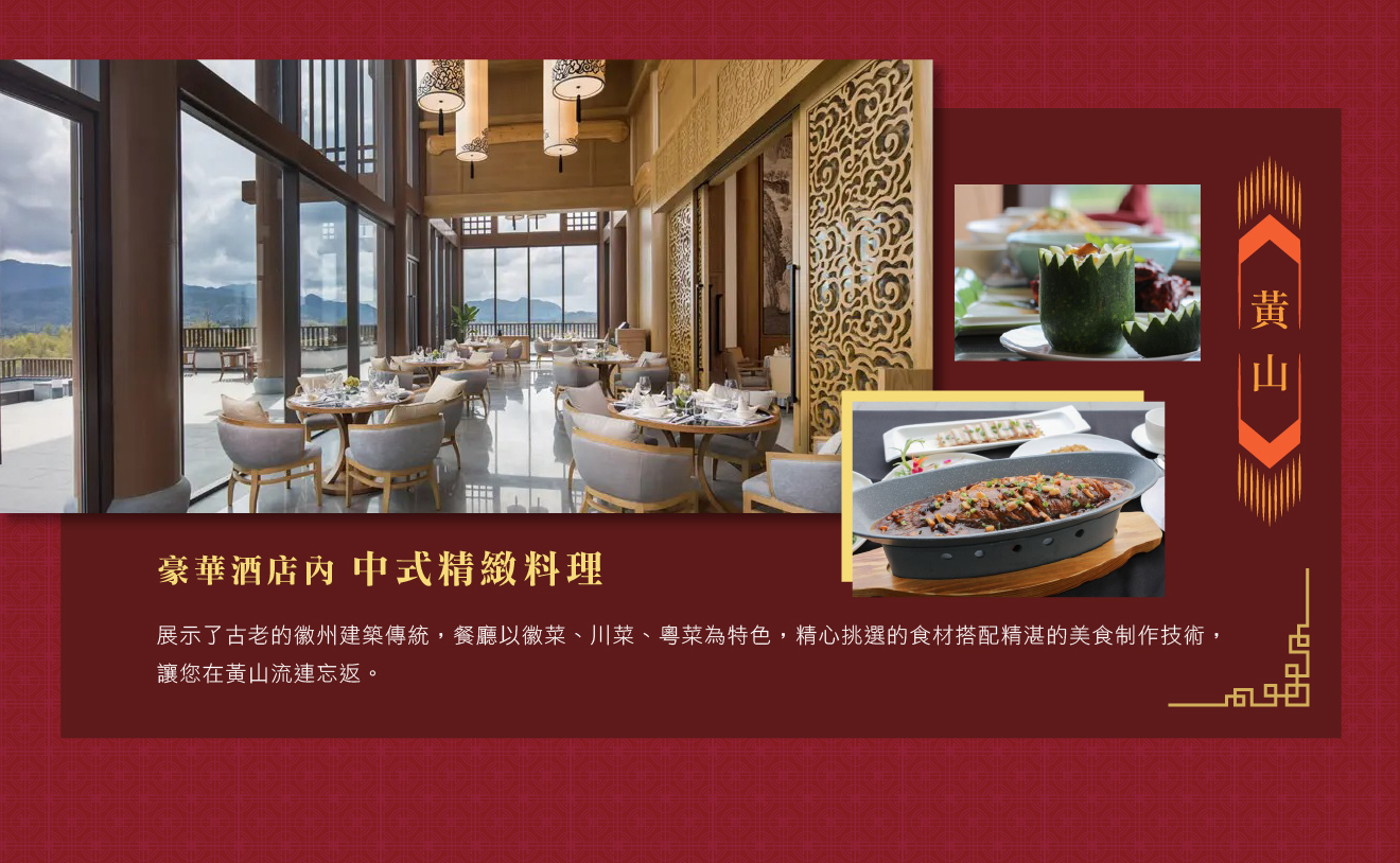 早餐:酒店內 午餐:景區中式自助料理 晚餐:特別安排酒店內精緻徽派風味料理