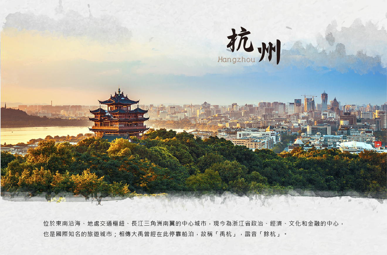 【杭州】浙江省會,是歷史悠久的文化名城與著名旅遊勝地,被譽為「人間天堂」,以秀麗的西湖聞名於世,湖光山色與亭台樓閣相映成趣,四季皆有不同風情,曾為南宋古都,留下豐富的歷史遺跡與人文底蘊;同時,也是茶葉與絲綢的發源地之一,龍井茶香與古典園林相得益彰。近年來,更以其創新科技與宜居環境,成為融合古典與現代的魅力城市。