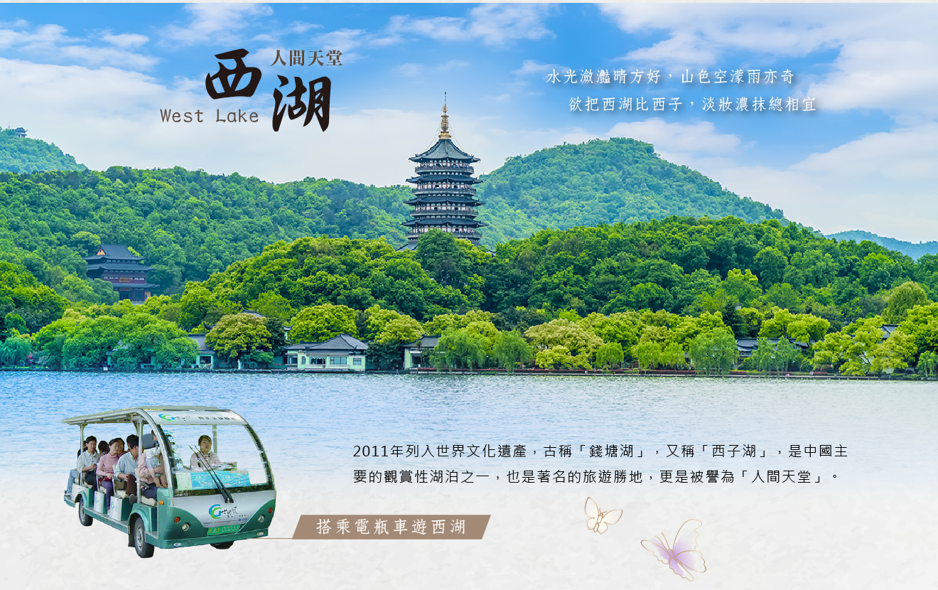 【杭州西湖文化景觀~電瓶車+遊船】2011年列入世界文化遺產,古稱「錢塘湖」,又稱「西子湖」,是著名的旅遊勝地,更是被譽為「人間天堂」。