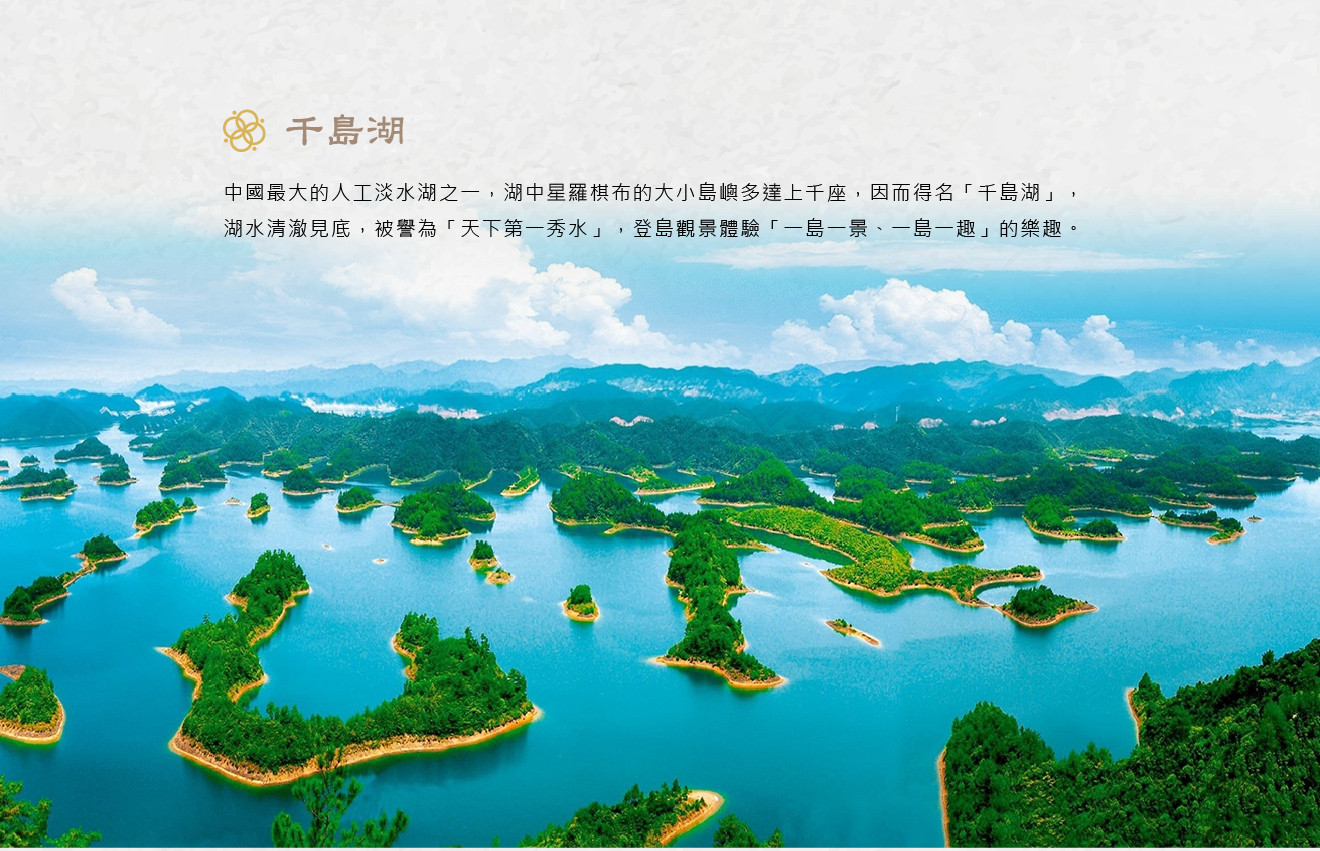 【千島湖】中國最大的人工淡水湖之一,湖中星羅棋布的大小島嶼多達上千座,因而得名「千島湖」,湖水清澈見底,被譽為「天下第一秀水」,四周群山環抱,風光秀麗氣候宜人,搭乘遊船穿梭於碧波之間,登島觀景,體驗「一島一景、一島一趣」的樂趣,此外,還以純淨的水質聞名;這裡不僅是休閒度假的勝地,也是攝影、健行與生態旅遊的熱門地點,湖光山色與人文風情交織出獨特的徽州魅力。