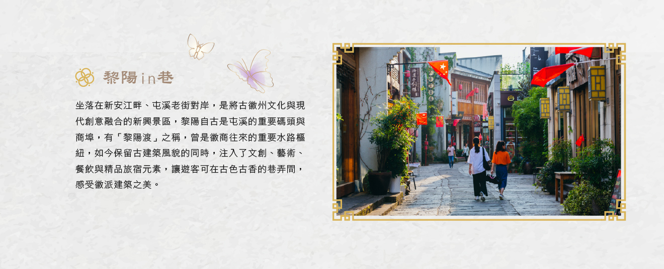 【夜遊黎陽in巷】坐落在新安江畔、屯溪老街對岸,是將古徽州文化與現代創意融合的新興景區,黎陽自古是屯溪的重要碼頭與商埠,有「黎陽渡」之稱,曾是徽商往來的重要水路樞紐,如今的黎陽水巷在保留古建築風貌的同時,注入了文創、藝術、餐飲與精品旅宿元素,讓遊客可在古色古香的巷弄間,感受徽派建築之美,也能享受悠閒的咖啡廳、設計小店與夜間燈光水景的浪漫氛圍,體驗新舊交融的徽州風情。