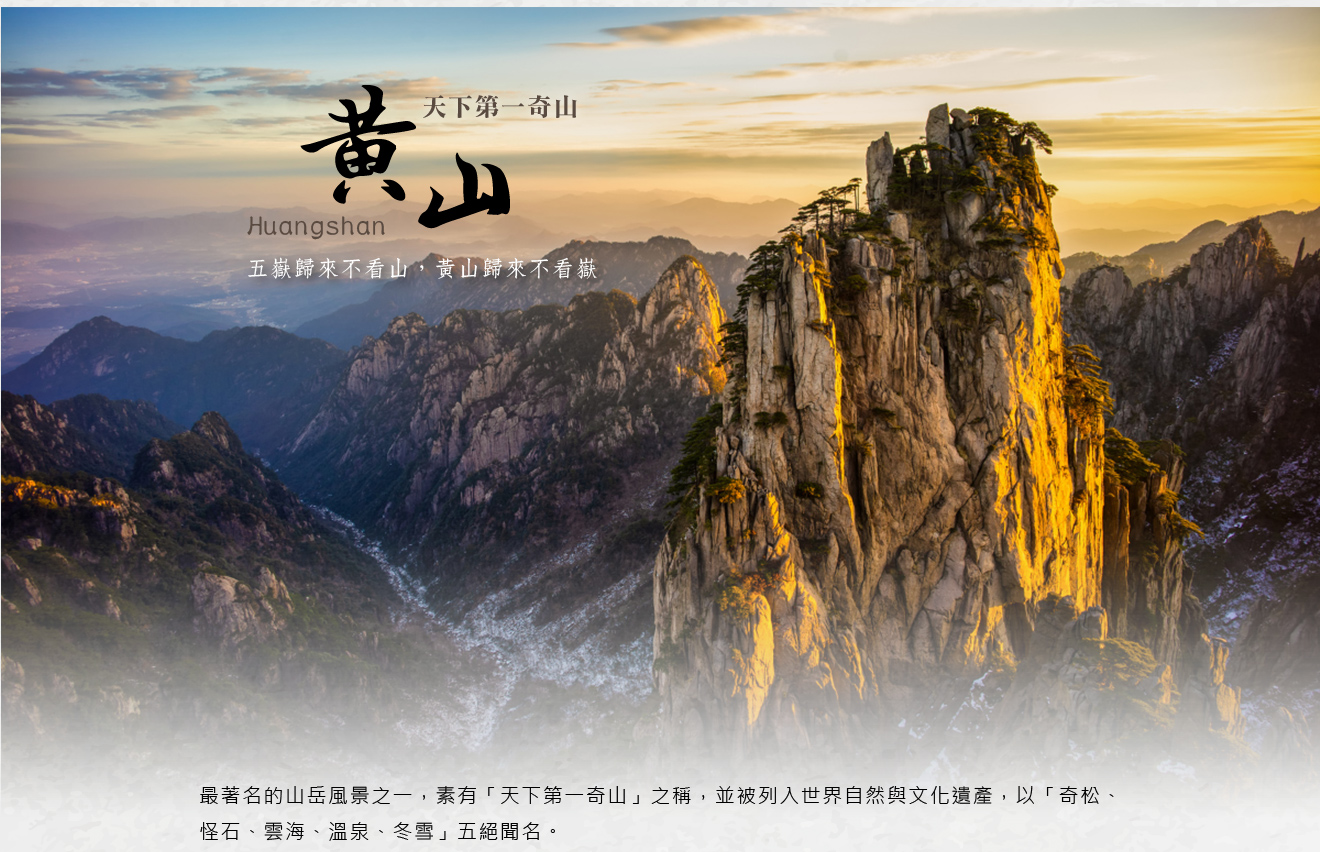 【黃山】最著名的山岳風景之一,素有「天下第一奇山」之稱,並被列入世界自然與文化遺產,以「奇松、怪石、雲海、溫泉、冬雪」五絕聞名,山勢雄偉壯麗,峰巒間雲霧繚繞,四季風光各具神韻,既可觀賞壯闊山景,也能體驗登山健行的樂趣;無論觀日出、賞雲海或漫步松林,皆能感受黃山獨有的仙境氣息。