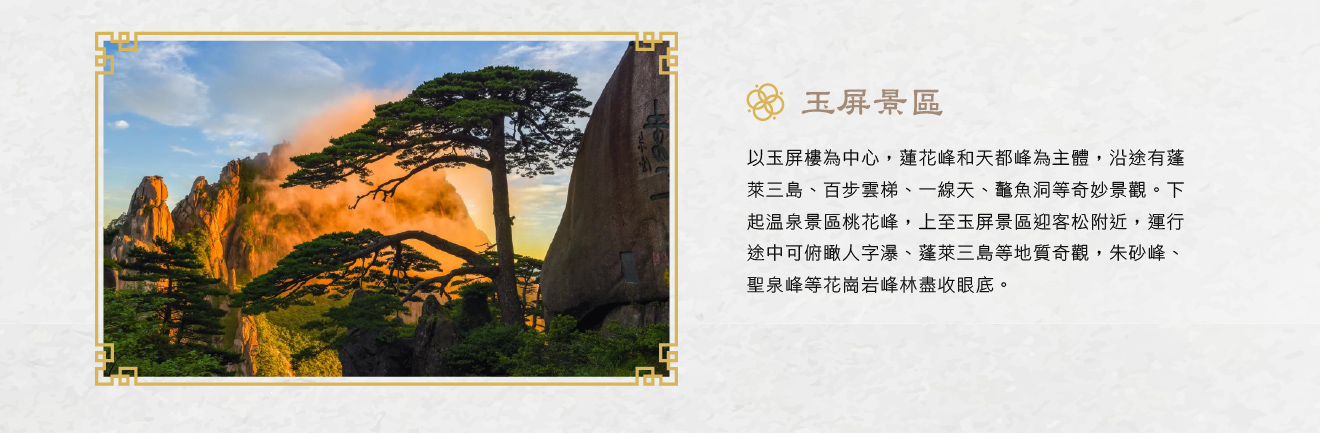 【玉屏景區、索道站】景區以玉屏樓為中心,蓮花峰和天都峰為主體,通常所說的前山,就是這一景區,沿途有蓬萊三島、百步雲梯、一線天、鼇魚洞等奇妙景觀;玉屏索道是核心交通設施,採用8人吊廂式設計,索道全長2600公尺,下起溫泉景區桃花峰,上至玉屏景區迎客松附近,運行途中可俯瞰人字瀑、蓬萊三島等地質奇觀,朱砂峰、聖泉峰等花崗岩峰林盡收眼底。
