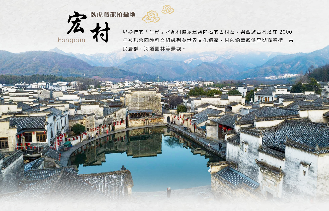 【宏村】以獨特的「牛形」水系和徽派建築聞名的古村落,與西遞古村落在2000年被聯合國教科文組織列為世界文化遺產,村內涵蓋徽派早期商業街、古民居群、河道園林等景觀,包含20餘幢異地搬遷修覆的徽派建築及明清街道、廊橋等場景;電影《臥虎藏龍》曾在此地取景,而聲名大噪。