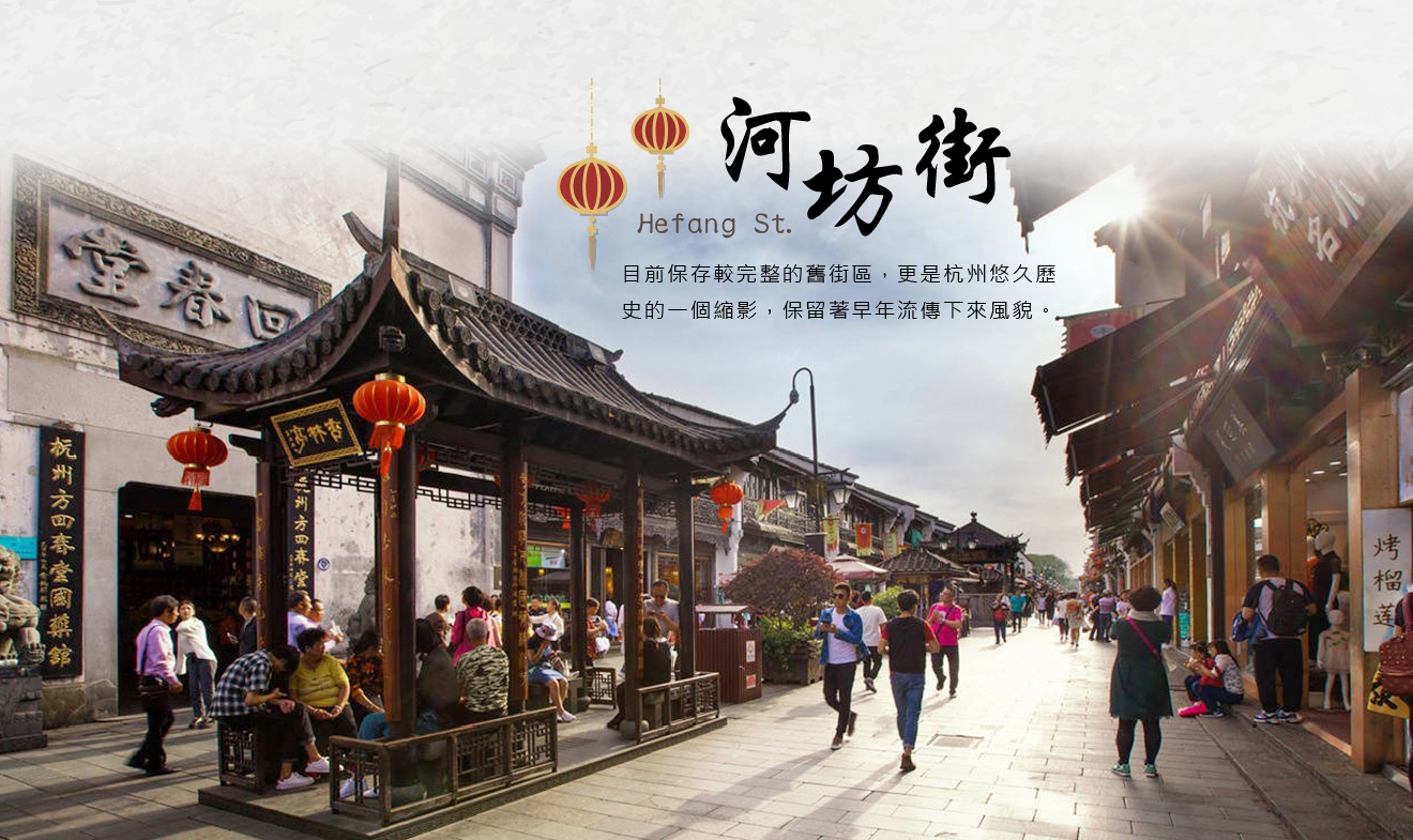 【河坊街】為歷史文化街區,也是目前保存較完整的舊街區,更是杭州悠久歷史的一個縮影,保留著早年流傳下來風貌,仍然有許多間生意興隆的老店,同時也引進了新類型的商家,店鋪應有盡有,整條街充滿了傳統風情以及文化氣息。
