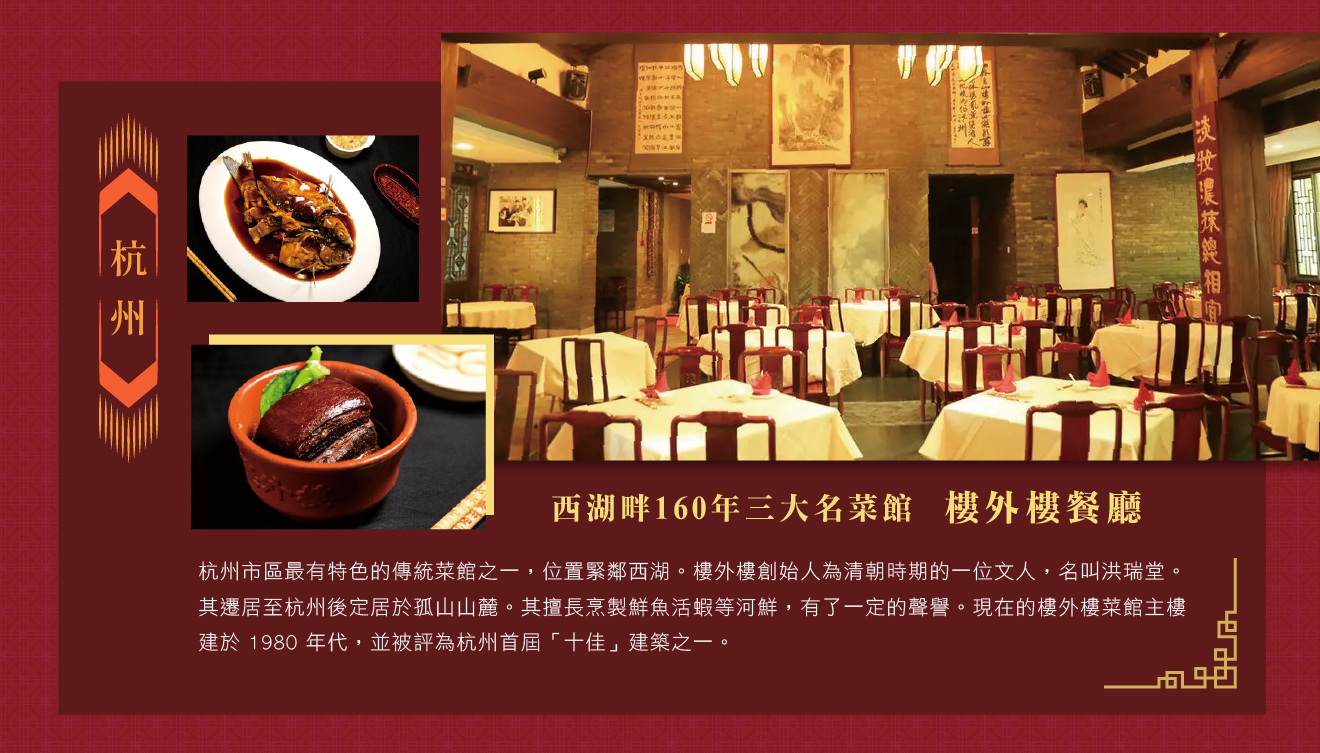早餐:酒店內 午餐:特別安排西湖畔160年三大名菜館樓外樓餐廳 晚餐:豪華酒店內精緻中式料理或自助餐