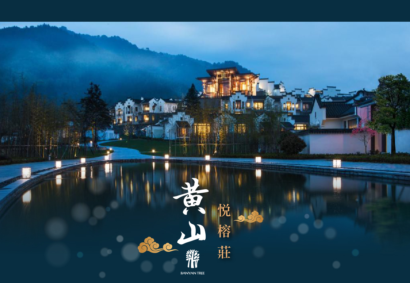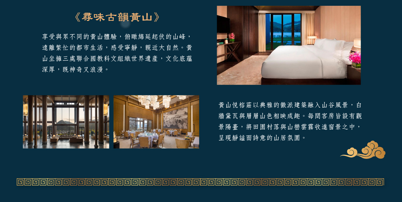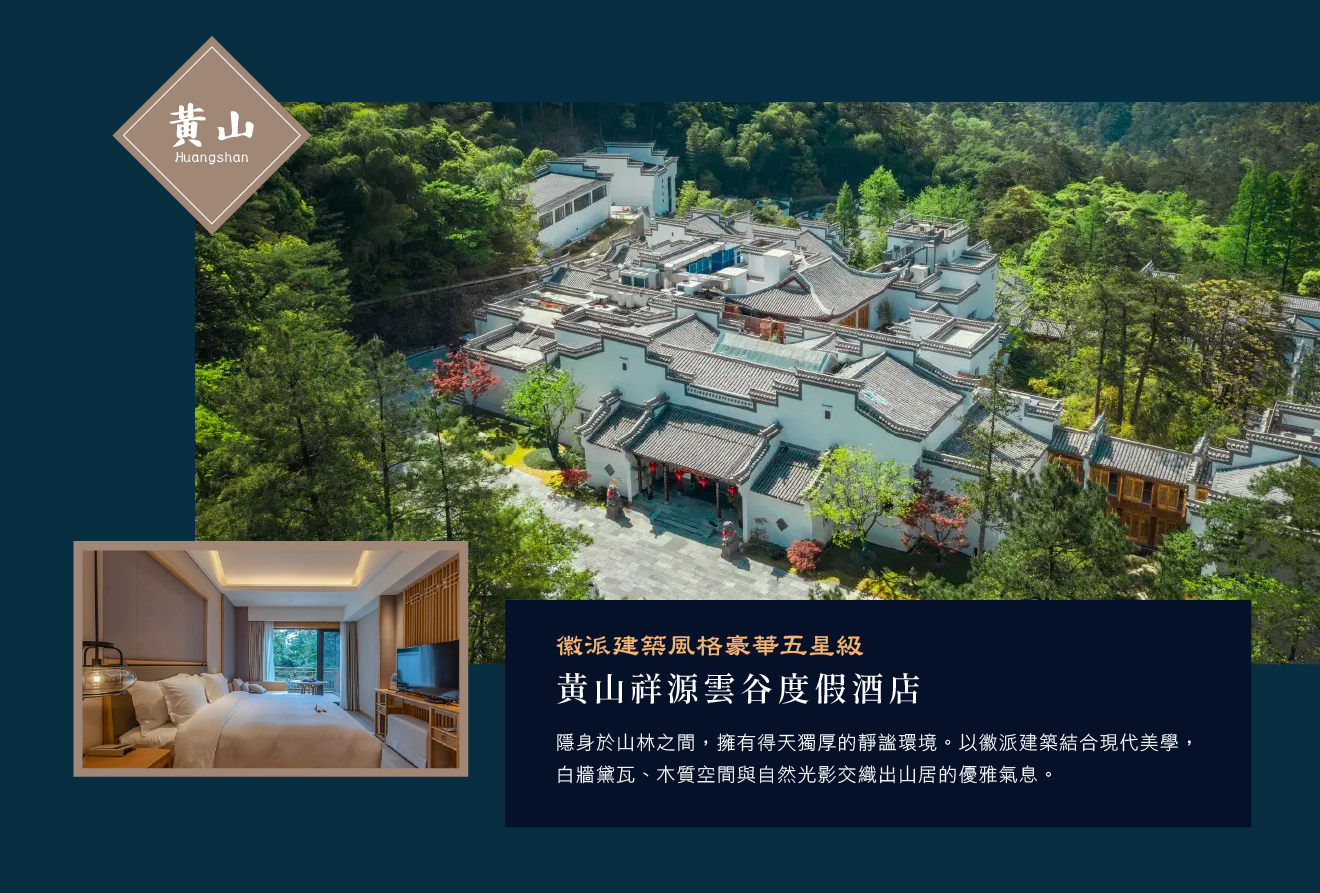 【黃山悅榕莊】2015年開業126間客房,館內設有水療中心、泳池與中西式餐廳,提供結合地方特色的養生料理與國際美饌;背倚青山、面朝田園,環境靜謐優雅結合自然山水與文化的頂級度假酒店;整體建築以傳統徽州元素為設計靈感,白牆黛瓦、飛檐翹角,融入現代簡約風格,呈現出古典與時尚並存的獨特美感,可遠眺山巒與田野,感受四季變化的自然氣息,是遠離塵囂、體驗慢生活的理想之地;夜幕降臨時,微風拂過竹影與水聲,展現出黃山山腳特有的詩意與禪意,讓旅人徹底放鬆身心,感受「山水入夢、靜心歸真」的度假境界。