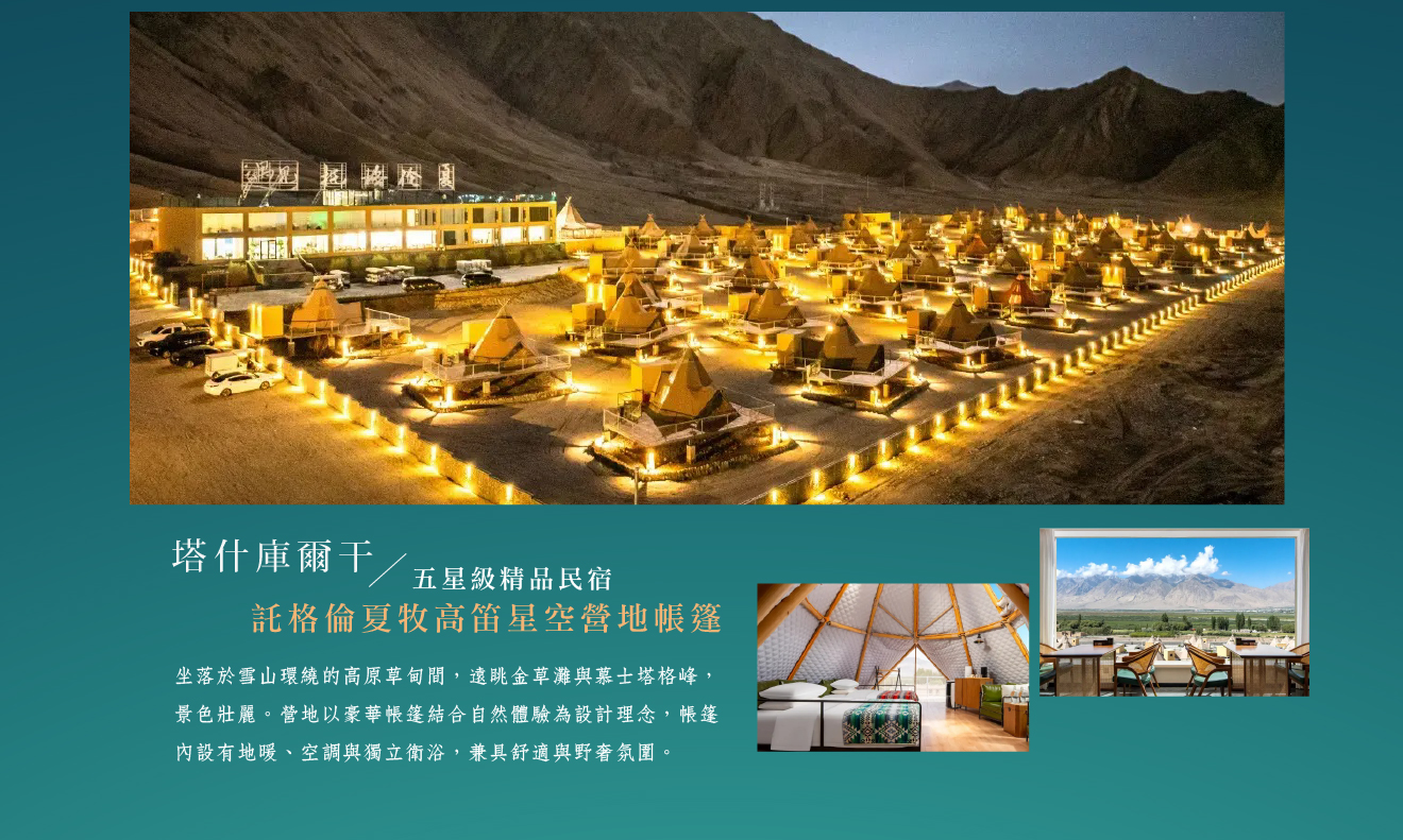住宿將優先以國家公園風景區五星精品民宿託格倫夏牧高笛星空營地帳篷(2024年開幕62間)標準型為優先(亦可另外付費升等豪華級房型,價差請洽業務承辦人);如遇訂滿或包場,將以市區豪華五星級酒店為安排。