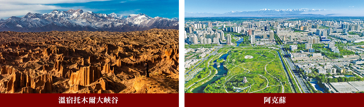 【阿克蘇】其名源自於流經該地的阿克蘇河,在突厥語中意為白水,歷史可追溯至西漢時期的西域古國姑墨,先後也歷經許多不同民族的統治。其地理位置介於天山山脈與塔里木盆地之間,是古代絲路重要的一個驛站。